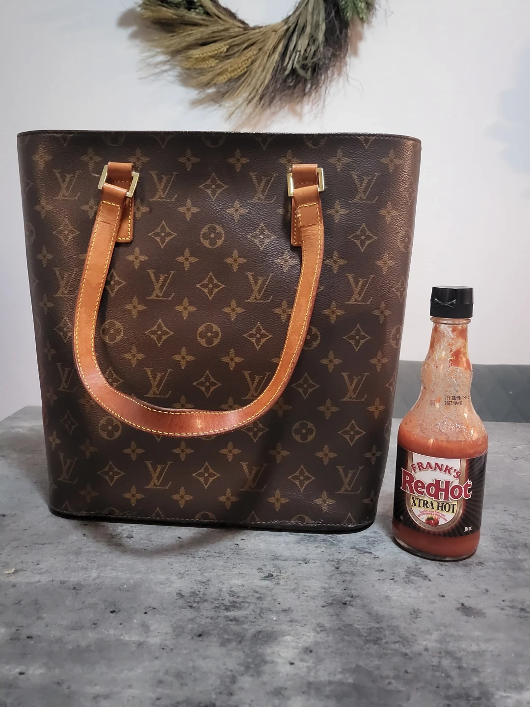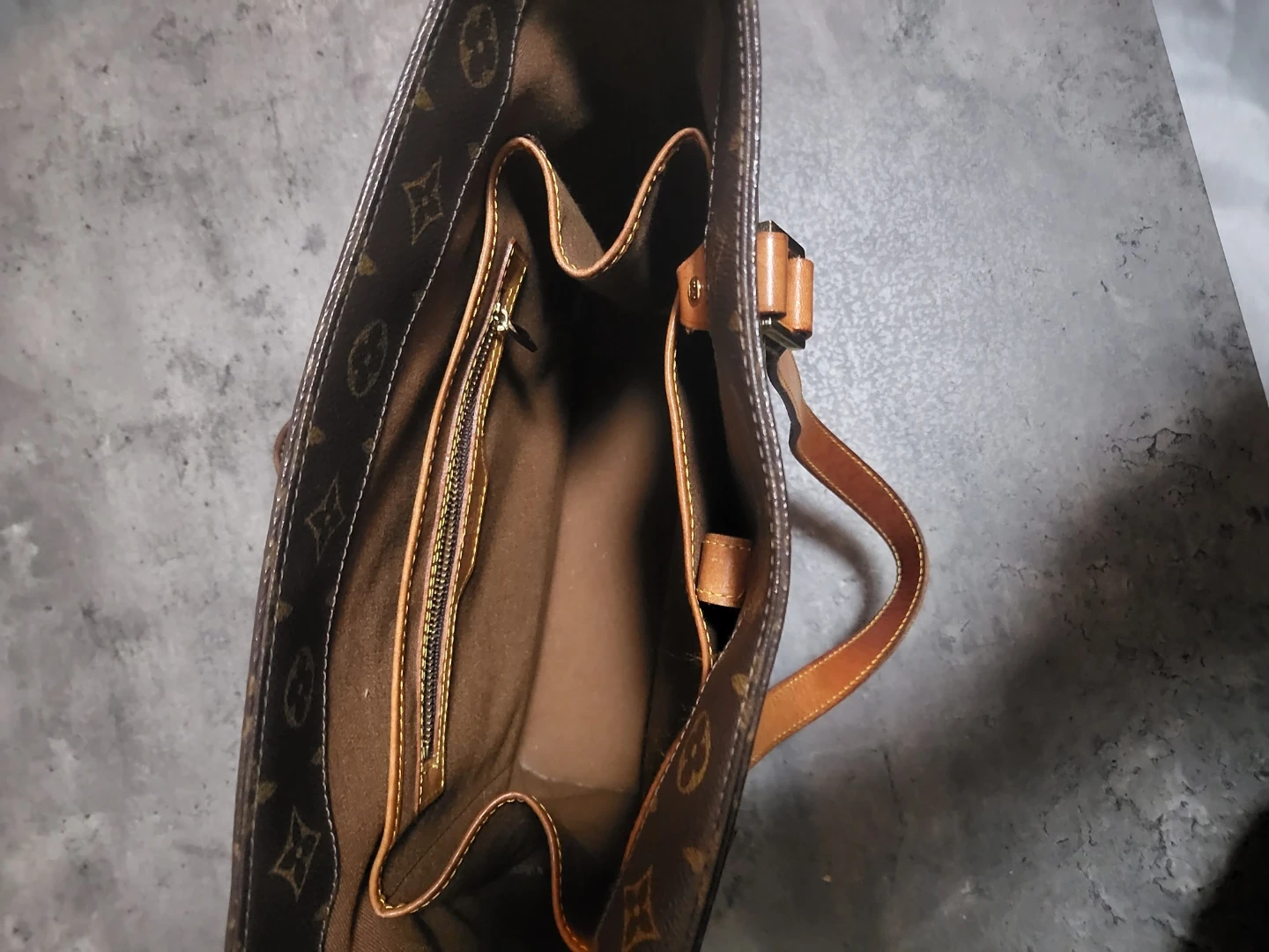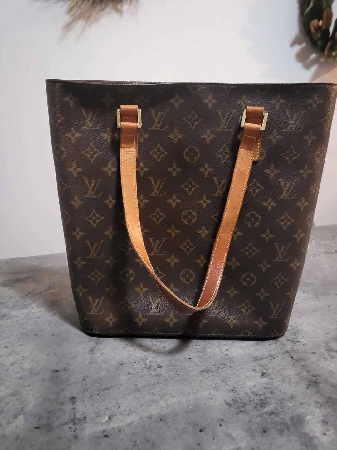 Classic Louis Vuitton tote bag in monogram canvas. It features leather handles and trim. Interior has multiple compartments, including a zippered pocket. This bag is perfect for everyday use or travel.
