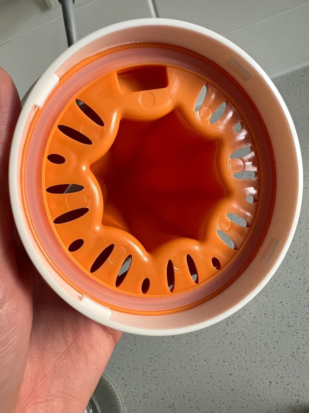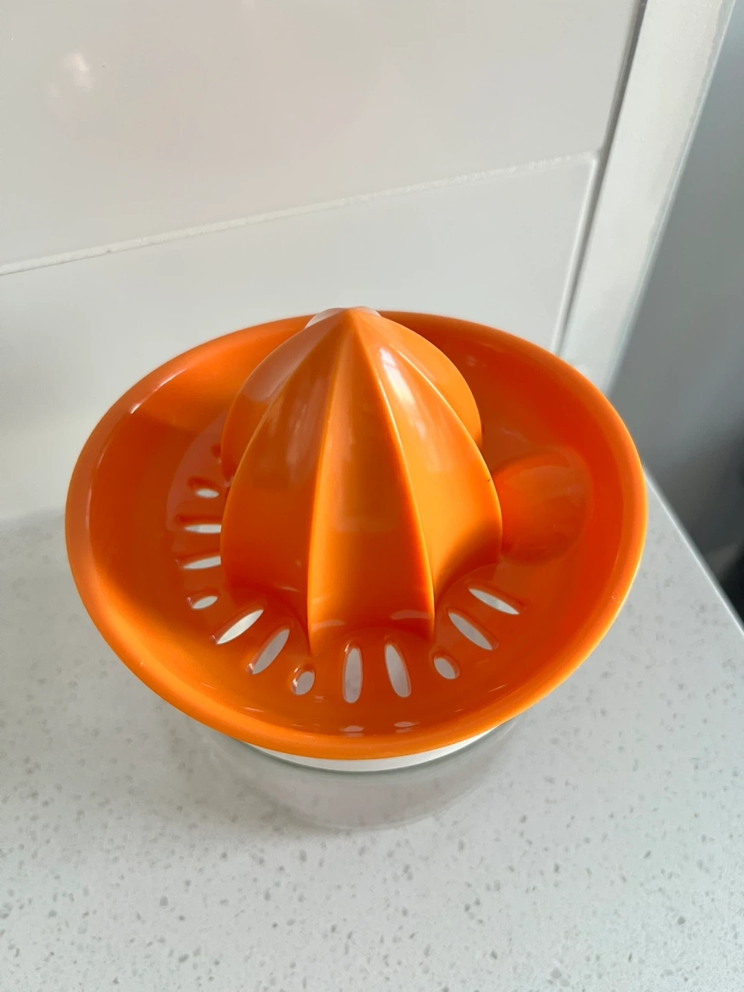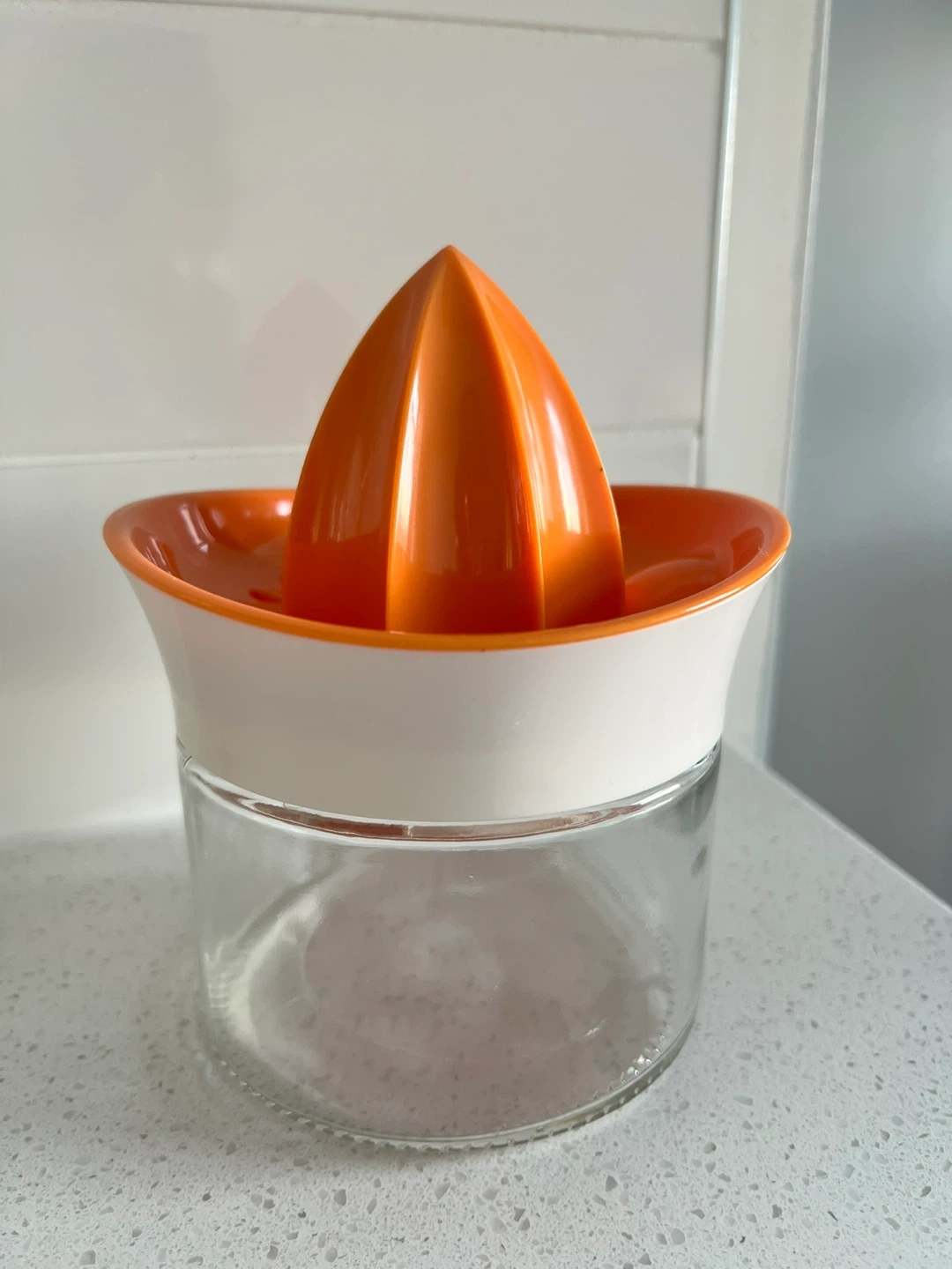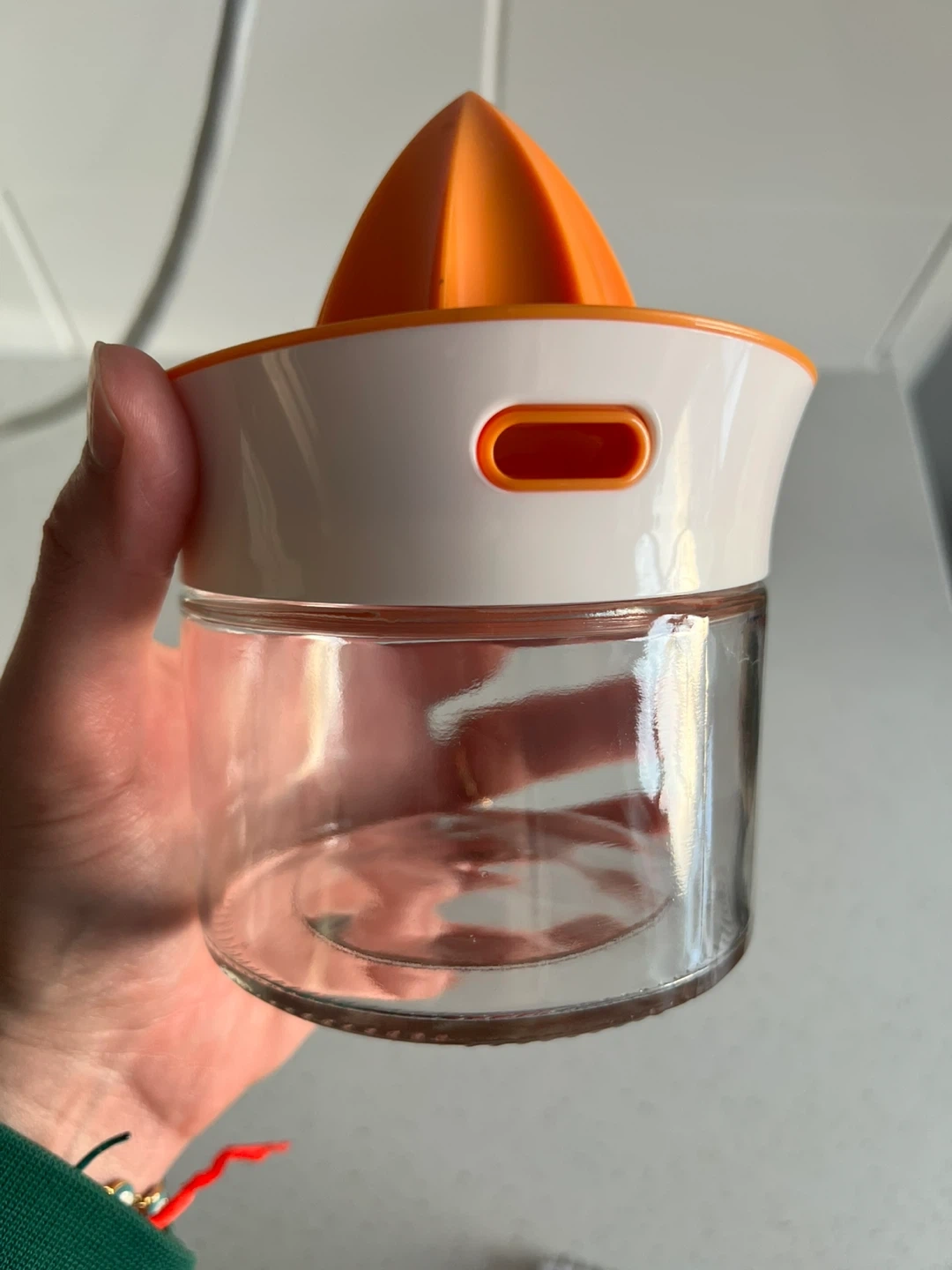 Handy manual citrus juicer with a glass container base. Perfect for quickly juicing lemons, limes, or oranges without the mess.