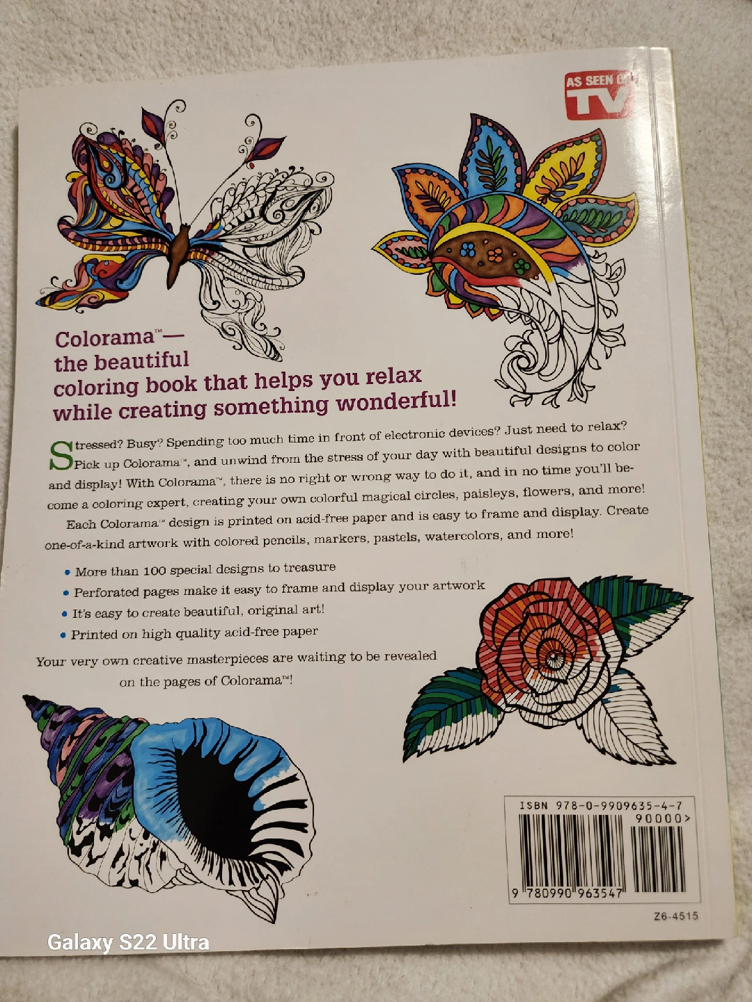 I'm selling a Colorama coloring book. It features flowers, paisleys, stained glass, and more! There are over 100 beautiful designs to treasure. Each design is printed on acid-free paper and is easy to frame and display. It's easy to create beautiful, original art!