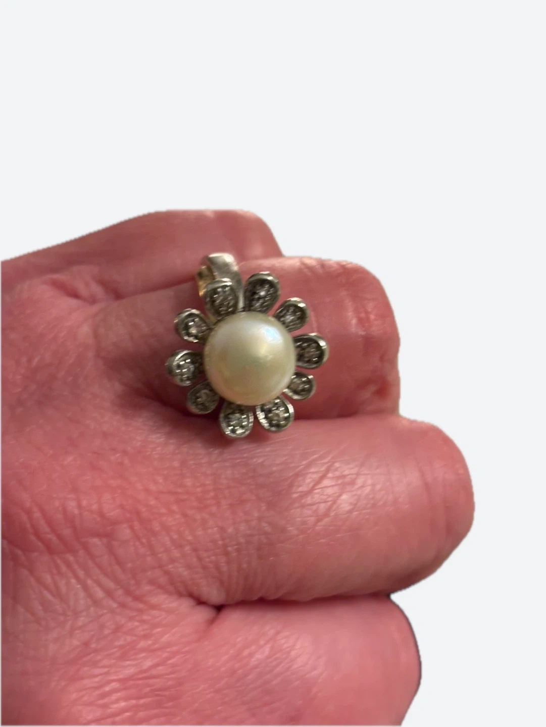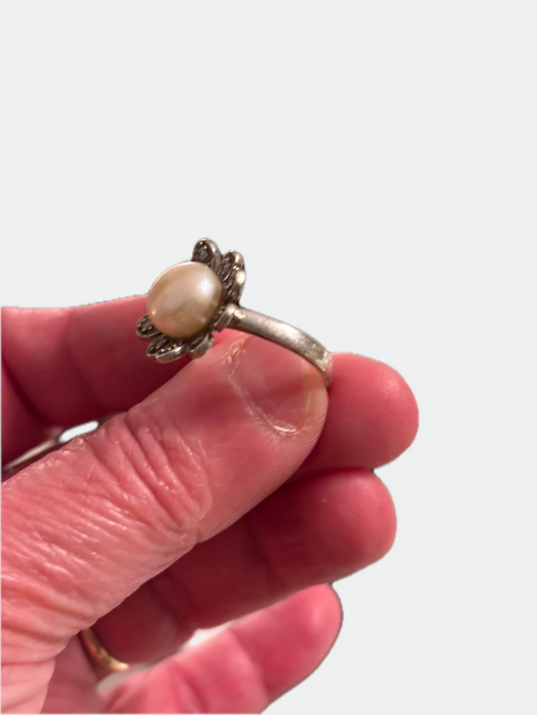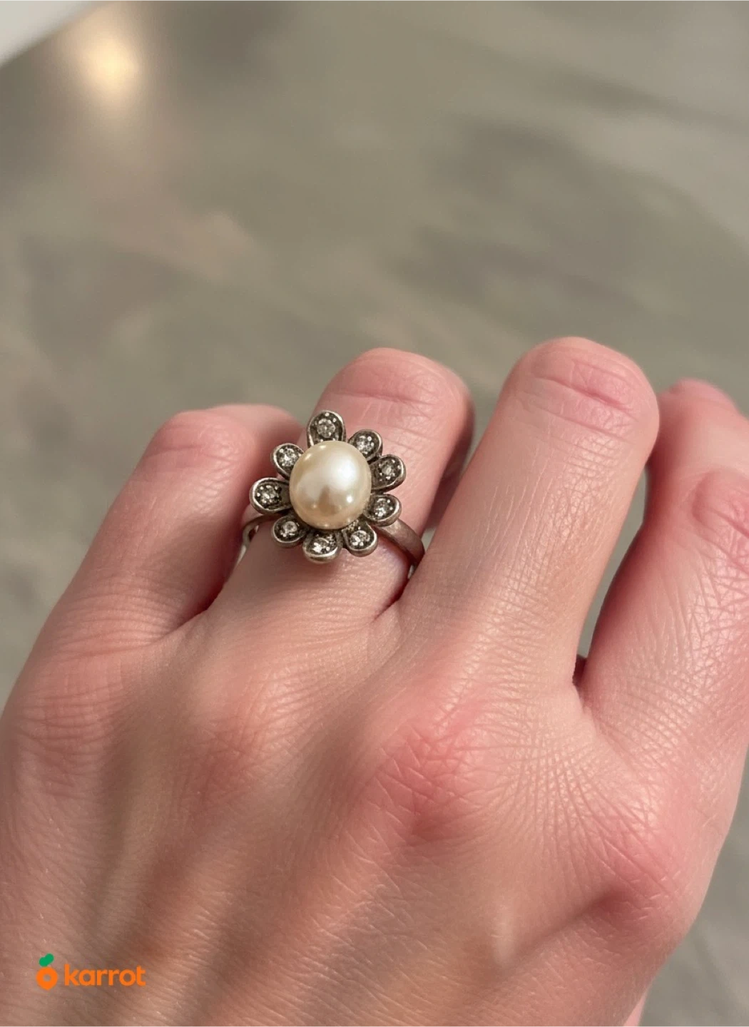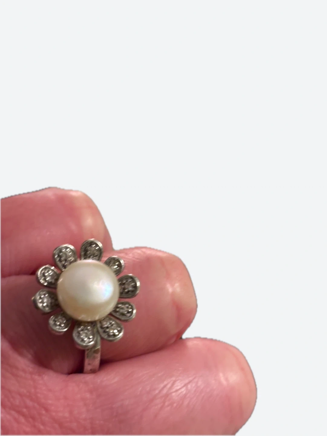A sweet vintage ring featuring a pearl centrepiece surrounded by a halo of sparkling rhinestones in a flower design. It's made of 925 real silver ring . This ring is a lovely accessory for adding a touch of classic charm!