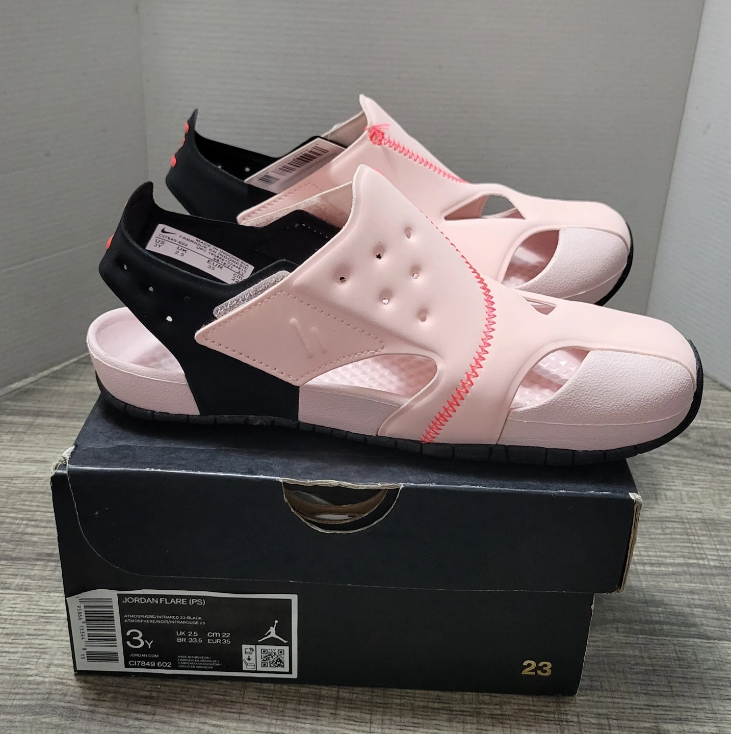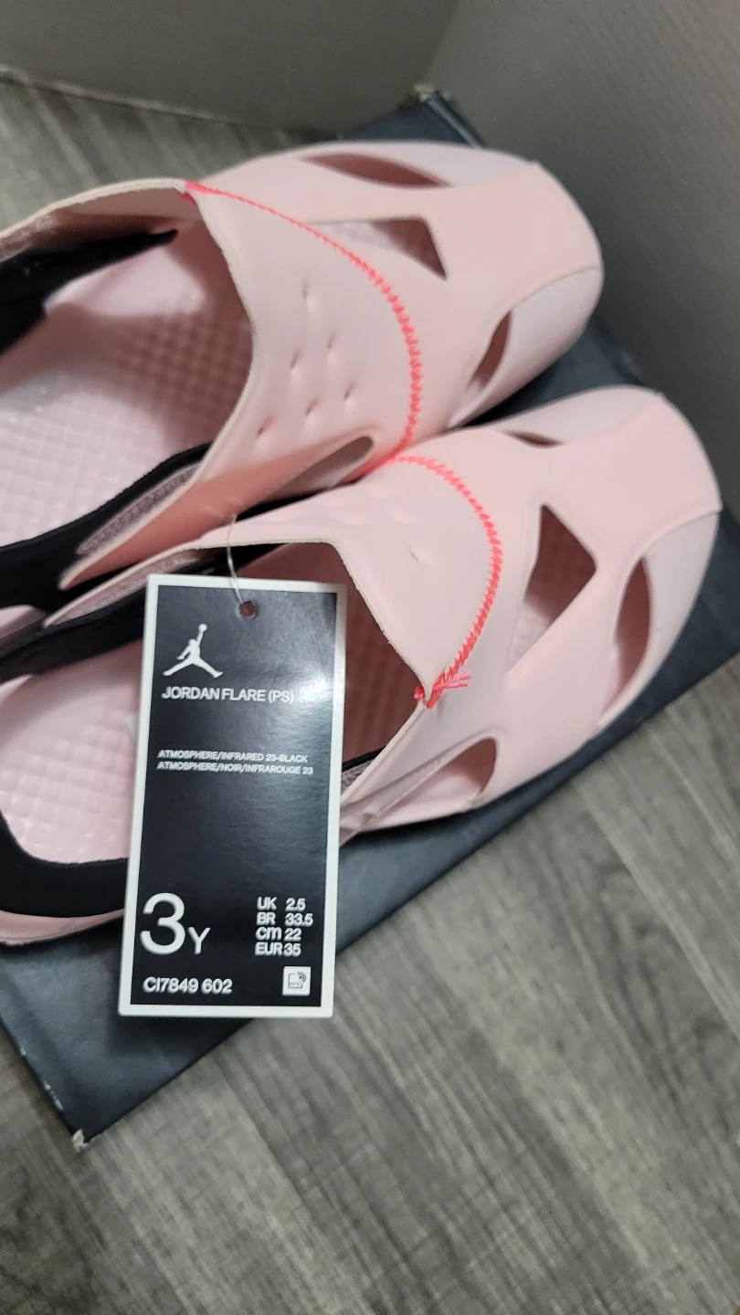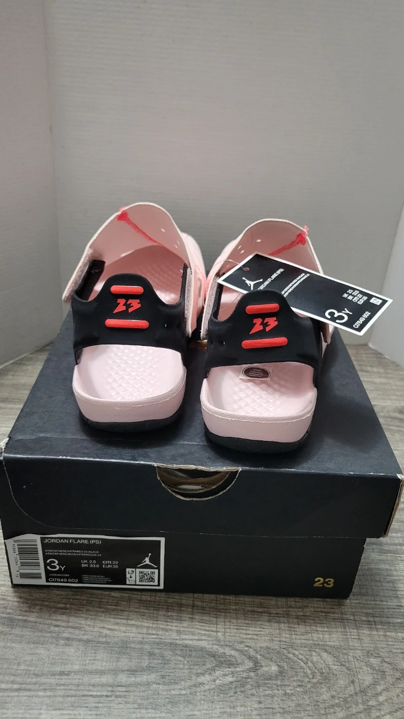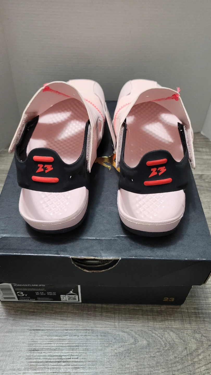 These are Jordan Flare (PS) sandals in a pink and black colorway. They're a youth size 3Y, with a UK size 2.5, BR 33.5, and EUR 35. The sandals come with their original box.