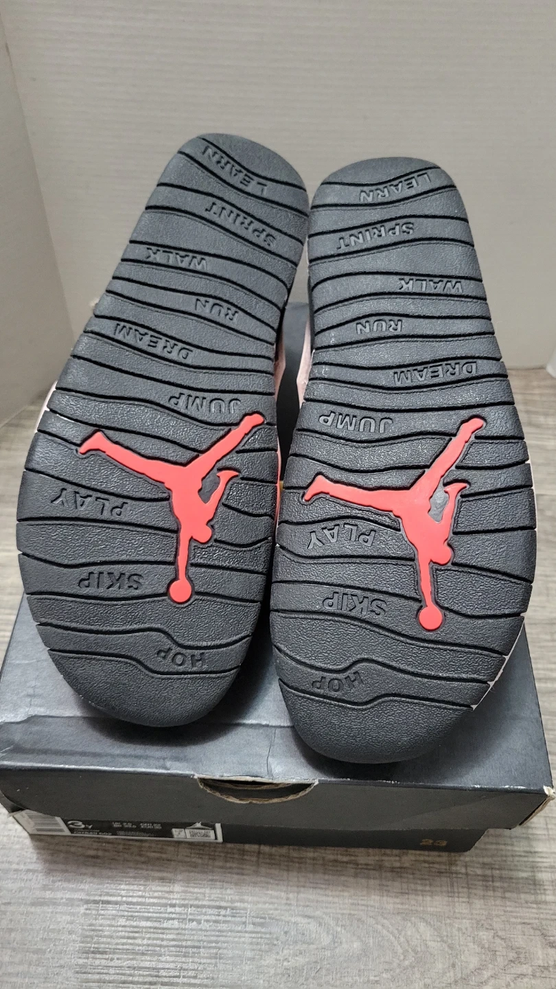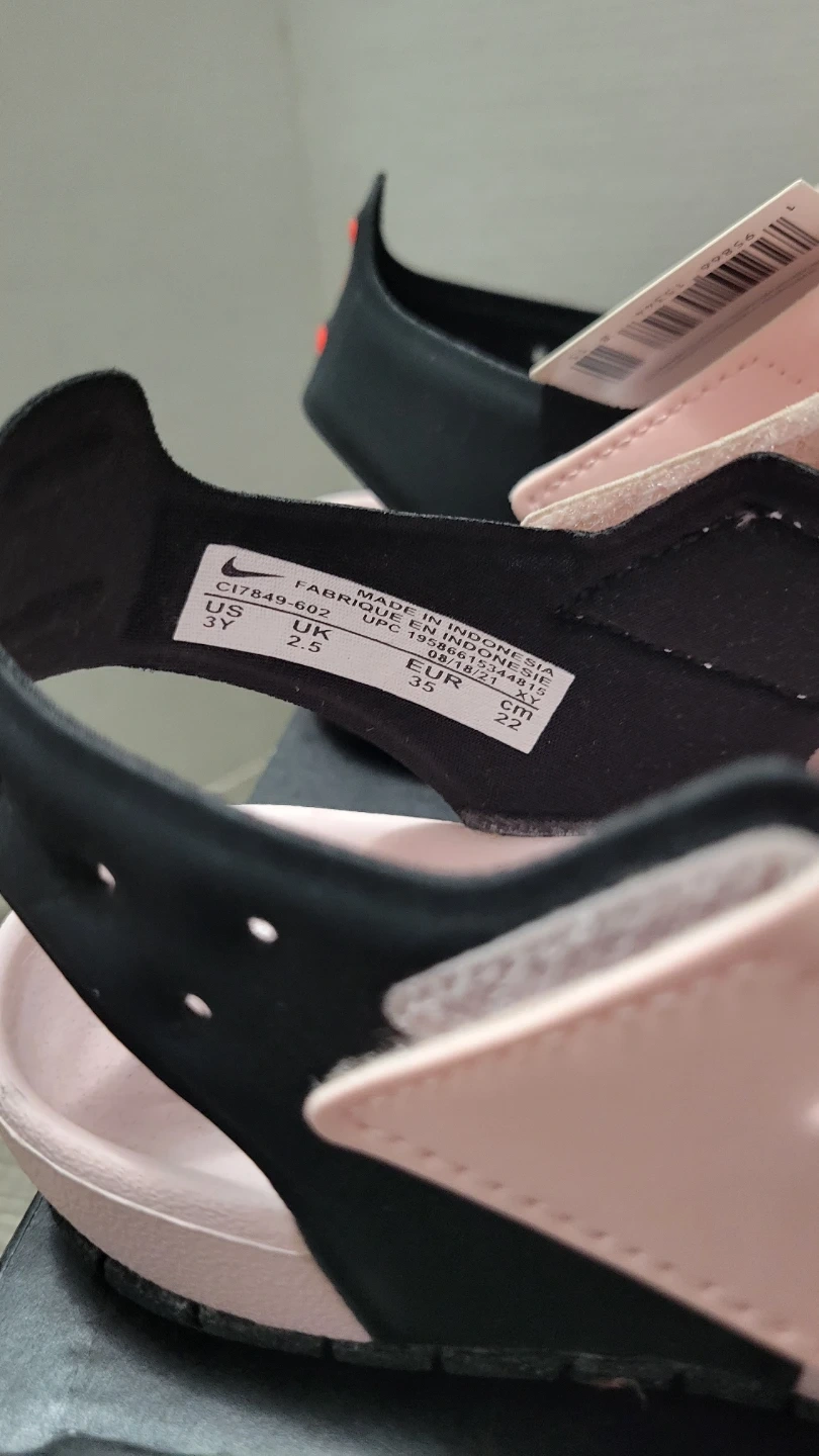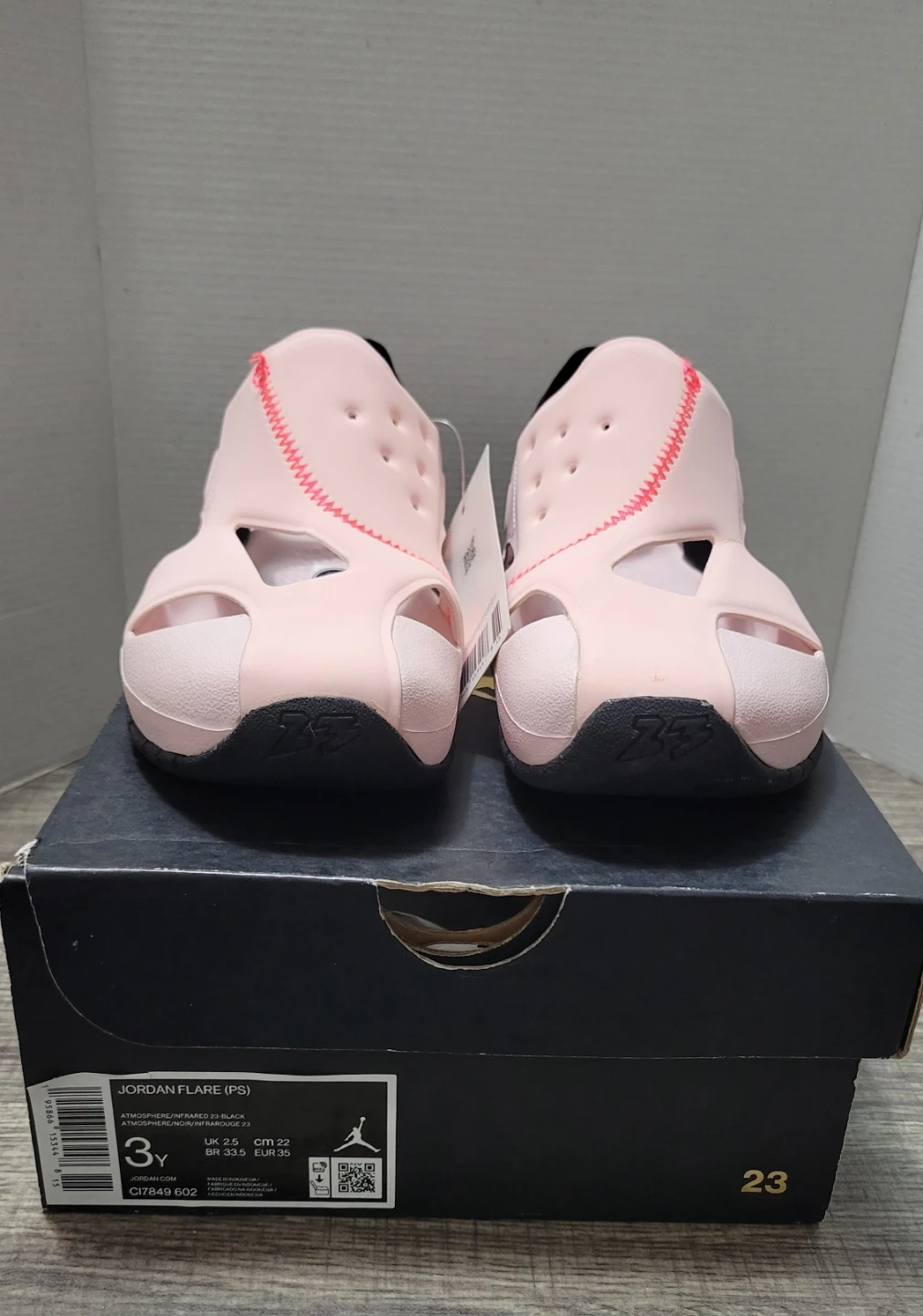 These are Jordan Flare (PS) sandals in a pink and black colorway. They're a youth size 3Y, with a UK size 2.5, BR 33.5, and EUR 35. The sandals come with their original box.