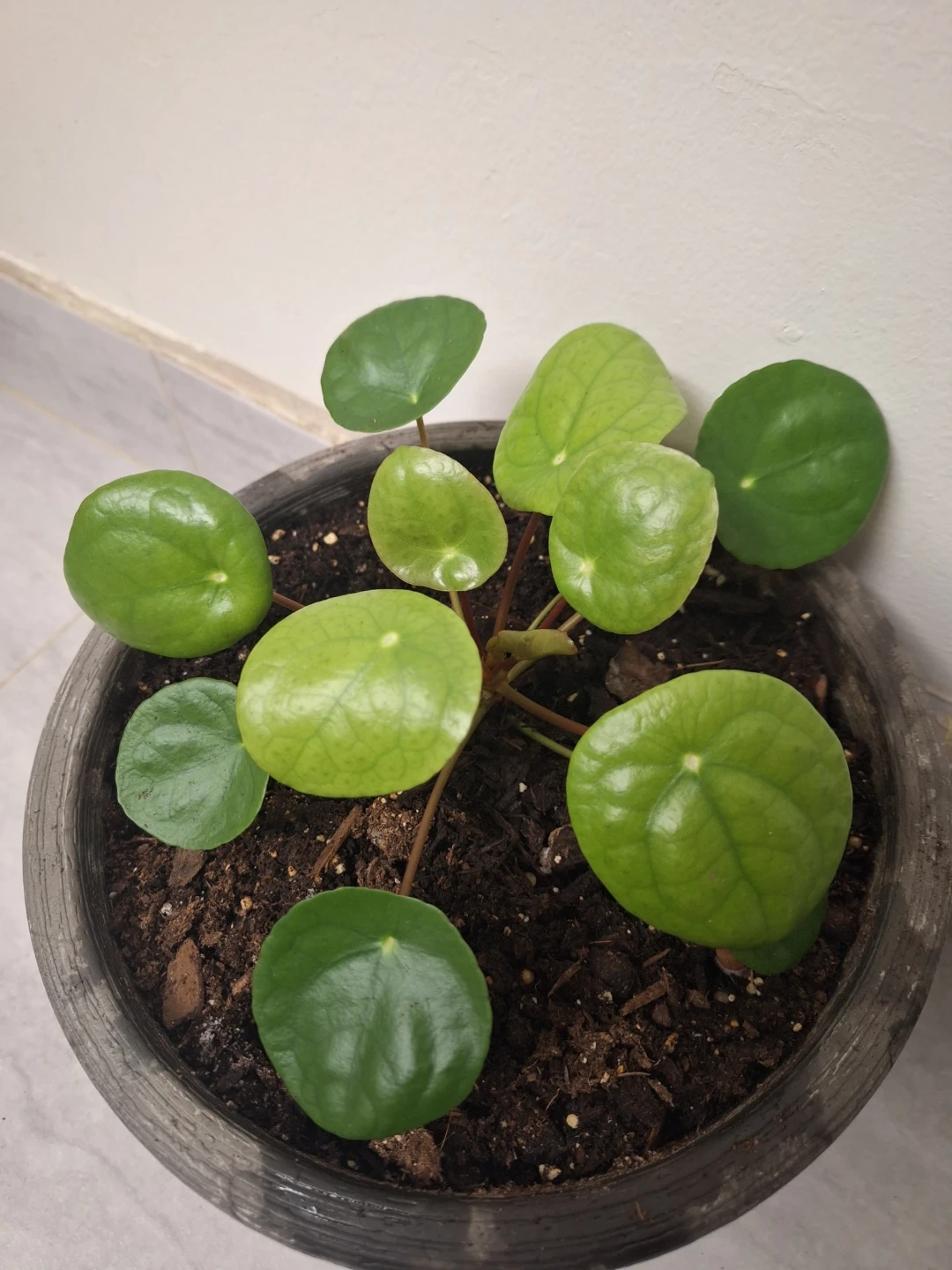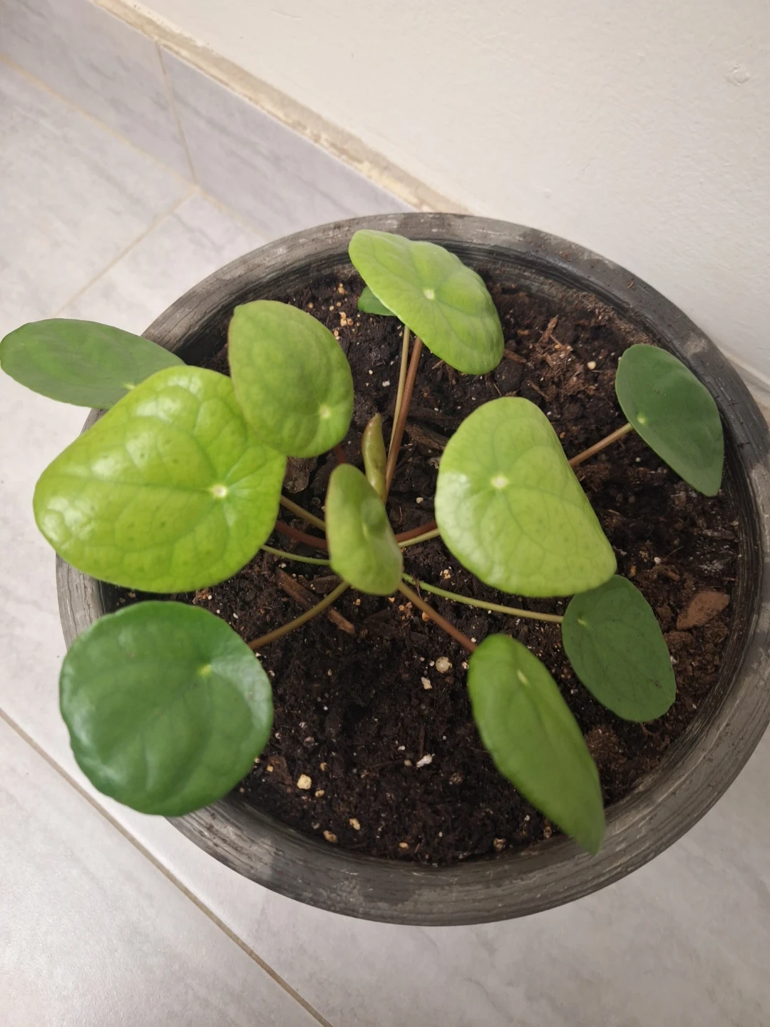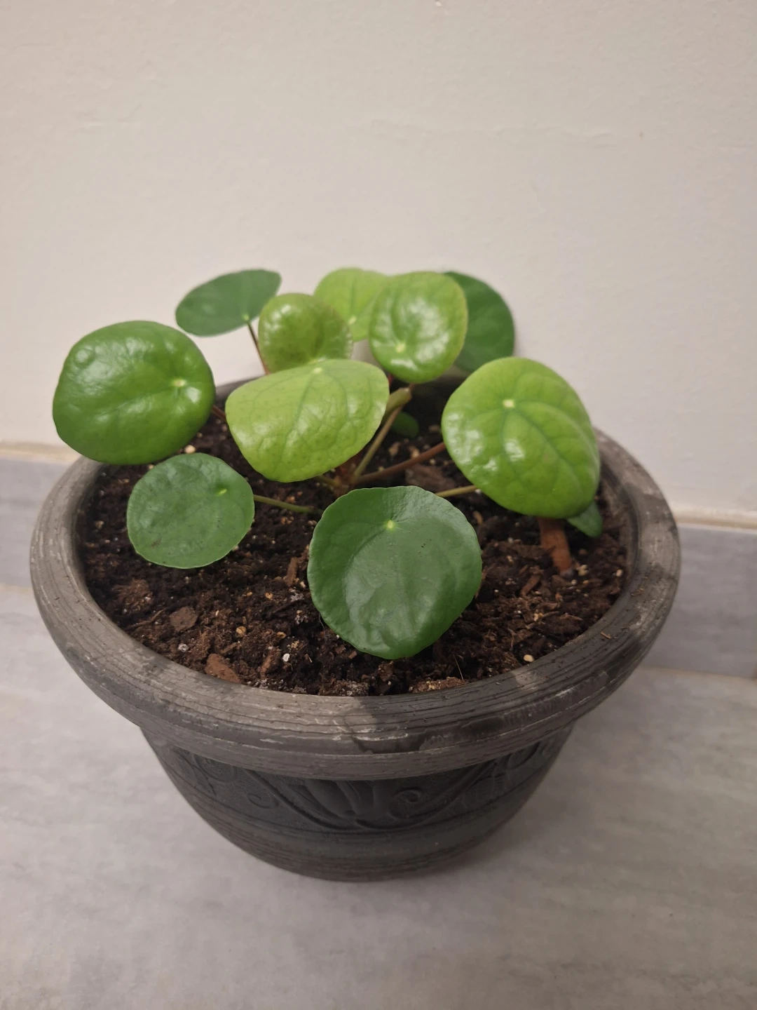Healthy Pilea Peperomioides plant in a grey pot. It's known for its unique, coin-shaped leaves and easy-care nature. This plant adds a touch of green to any indoor space! 8.5" pot
