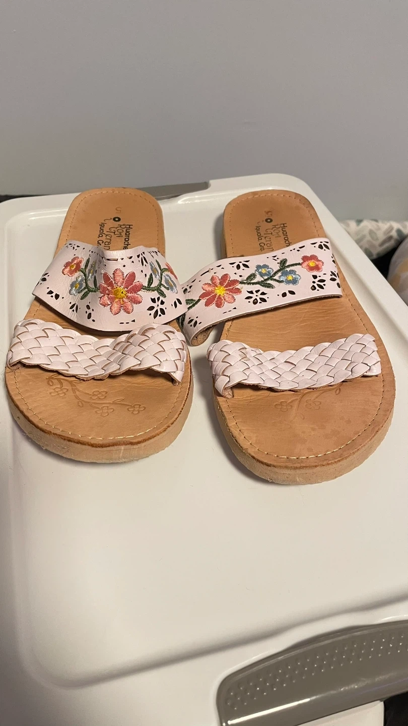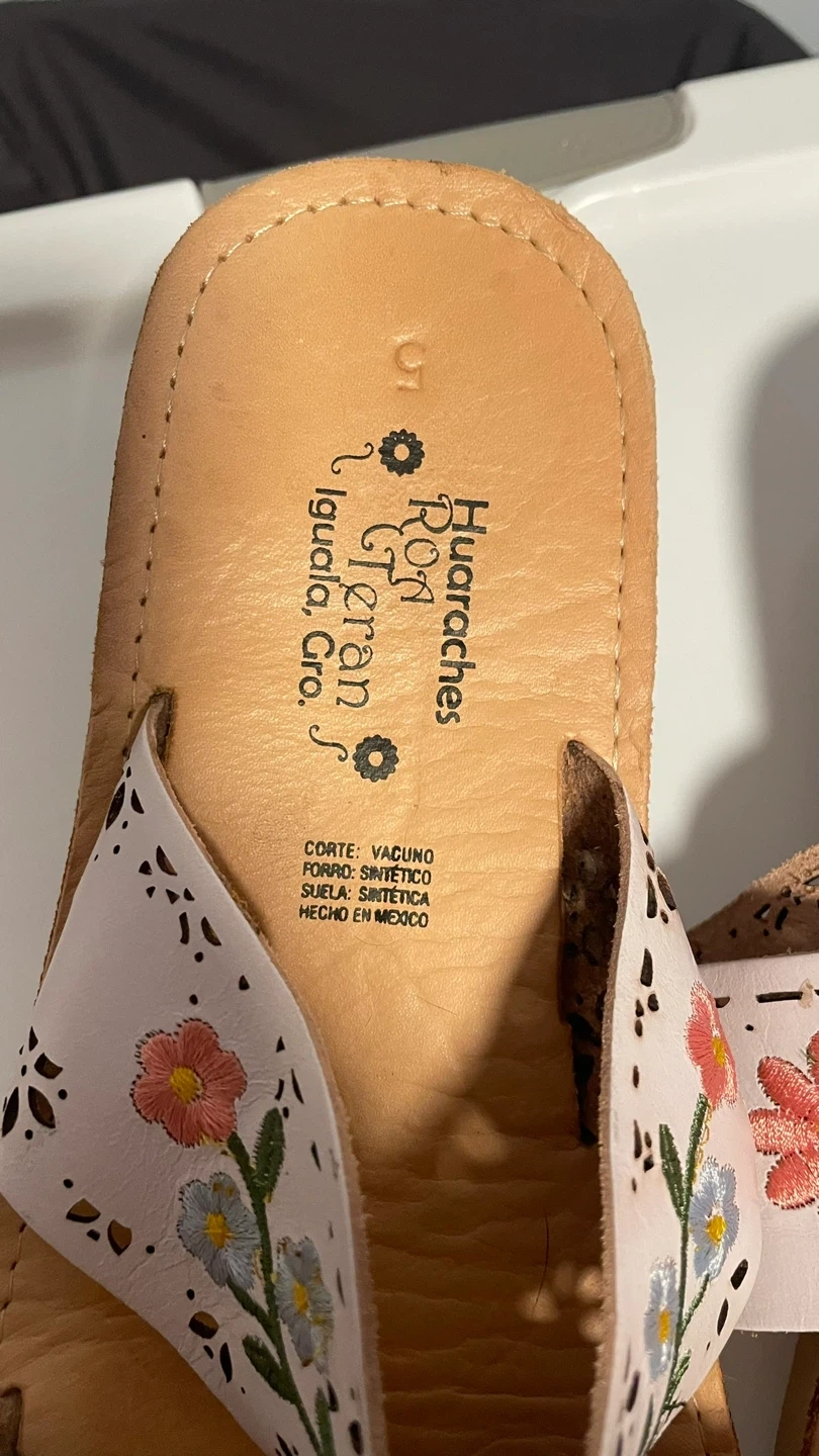 Huaraches Rojas sandals with floral embroidery. Size 5. Leather upper, synthetic sole, and lining. Made in Mexico!