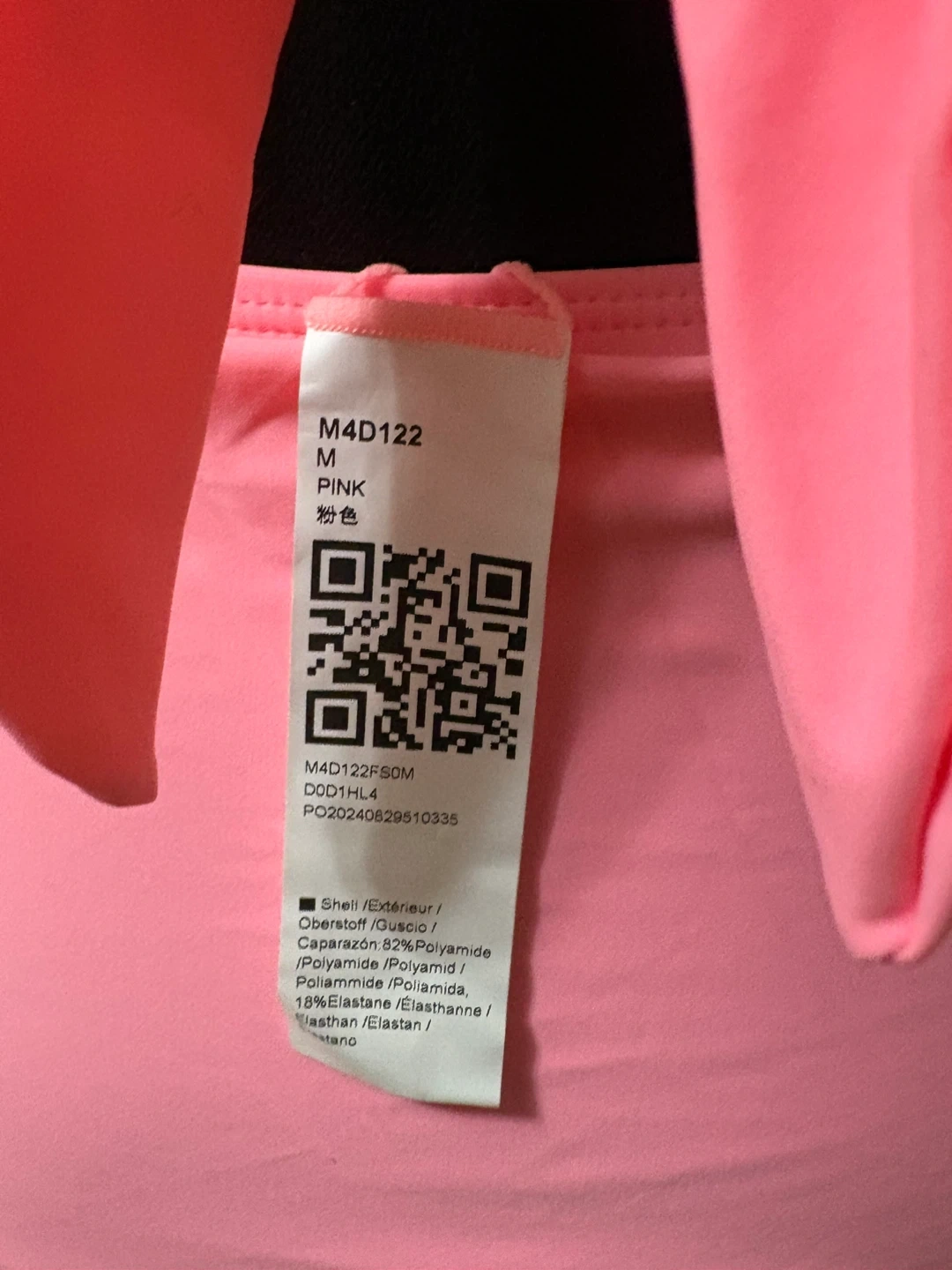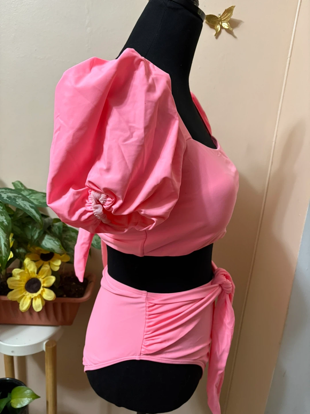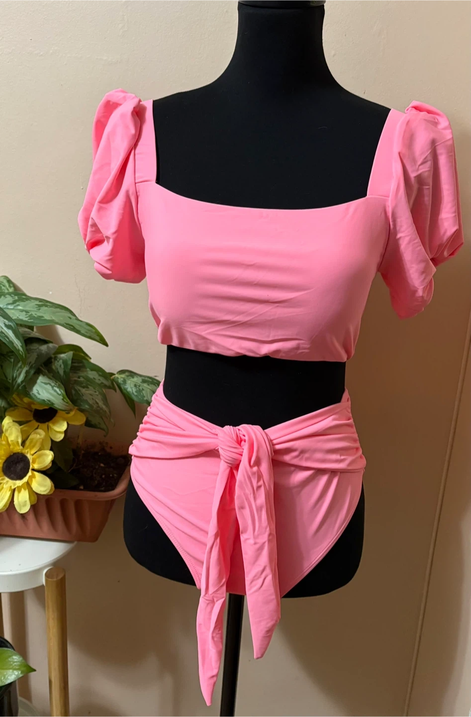 This pink bikini set features a square neckline with puff sleeves and high-waisted bottoms with a tie accent. It's made from a blend of polyamide and elastane. Size is medium.