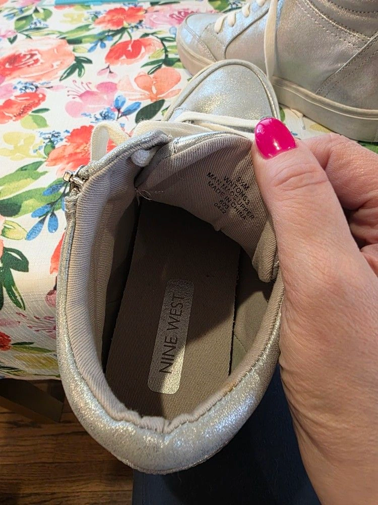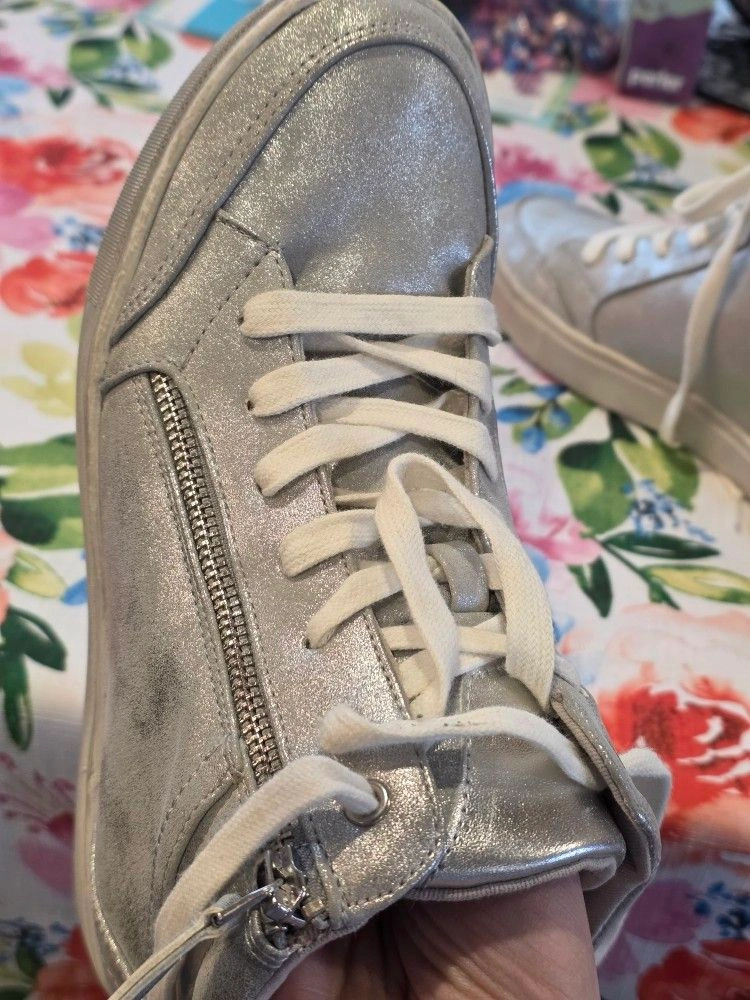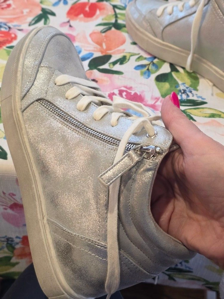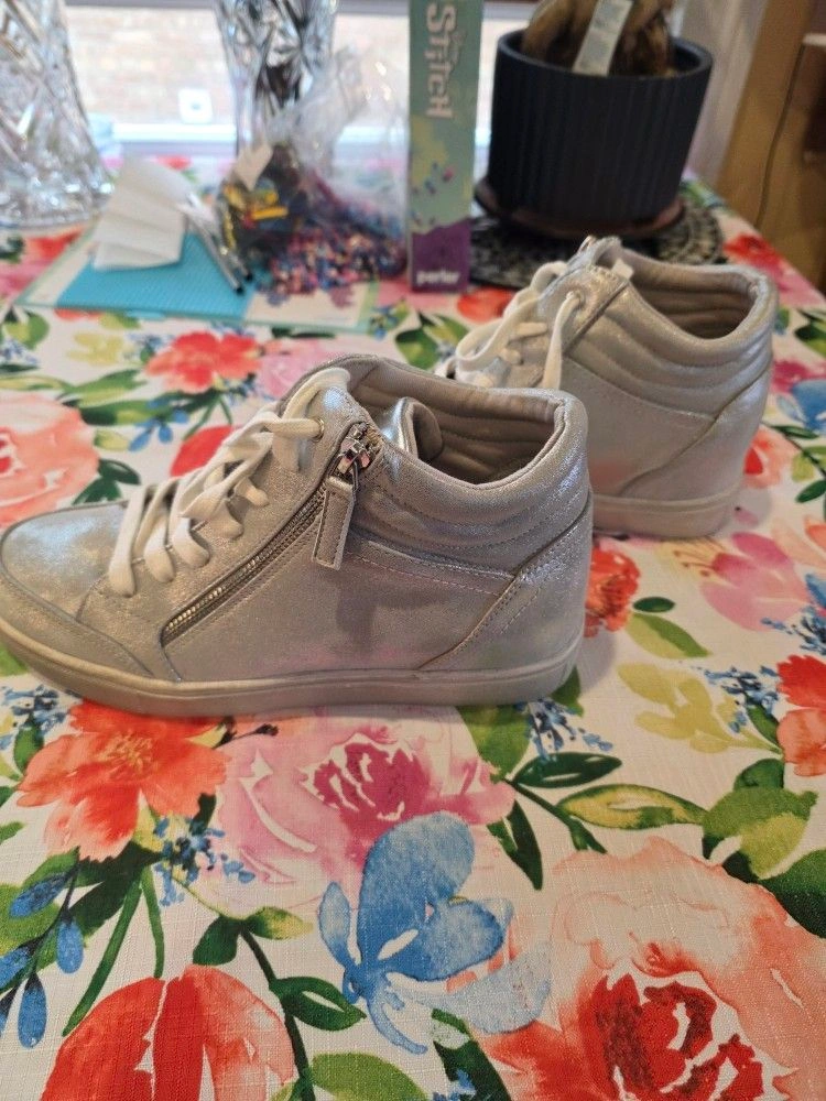 Never worn. Run slightly smaller, perfect for size 9. Heel height 2.17". This fashion sneaker is perfect for when you want some extra height but want to keep a sporty look. Size: 9, Color: Silver.