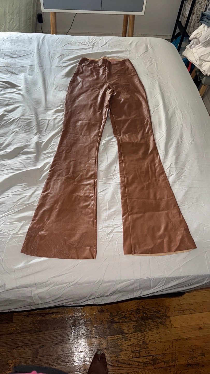 These brown faux leather flare pants are a stylish addition to any wardrobe! They offer a unique look and are perfect for making a statement. Feel free to message me with any questions!