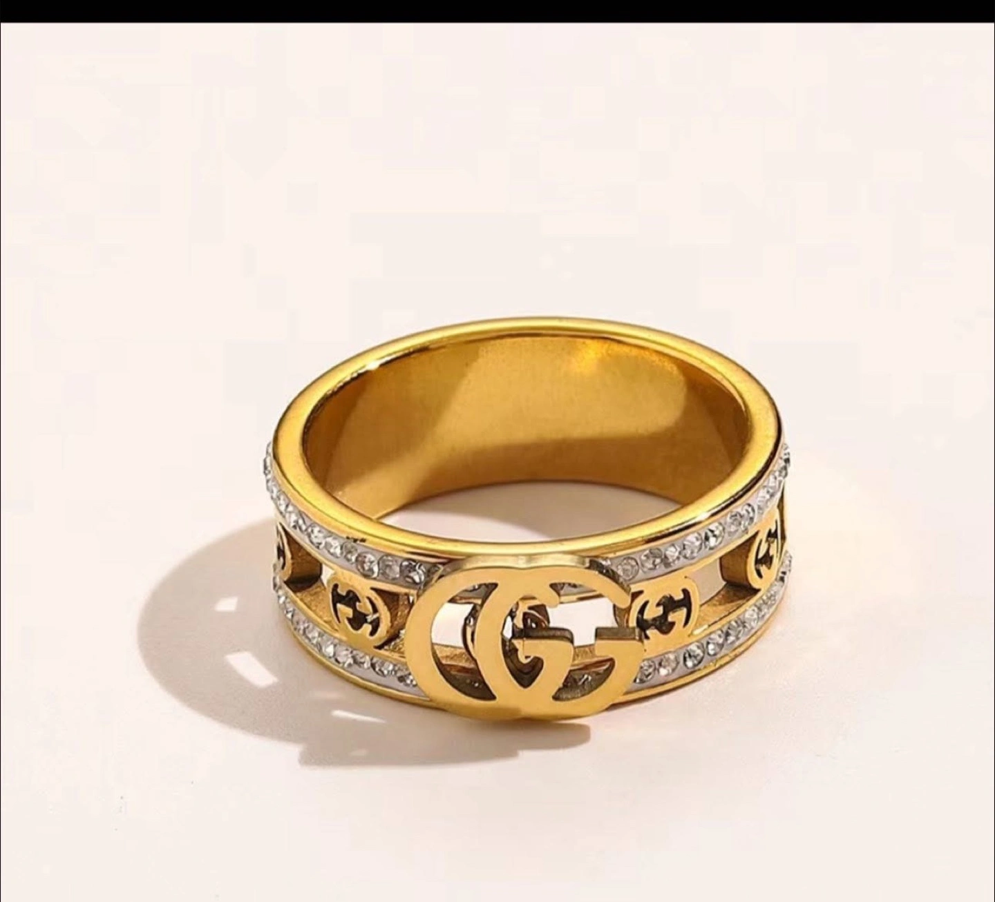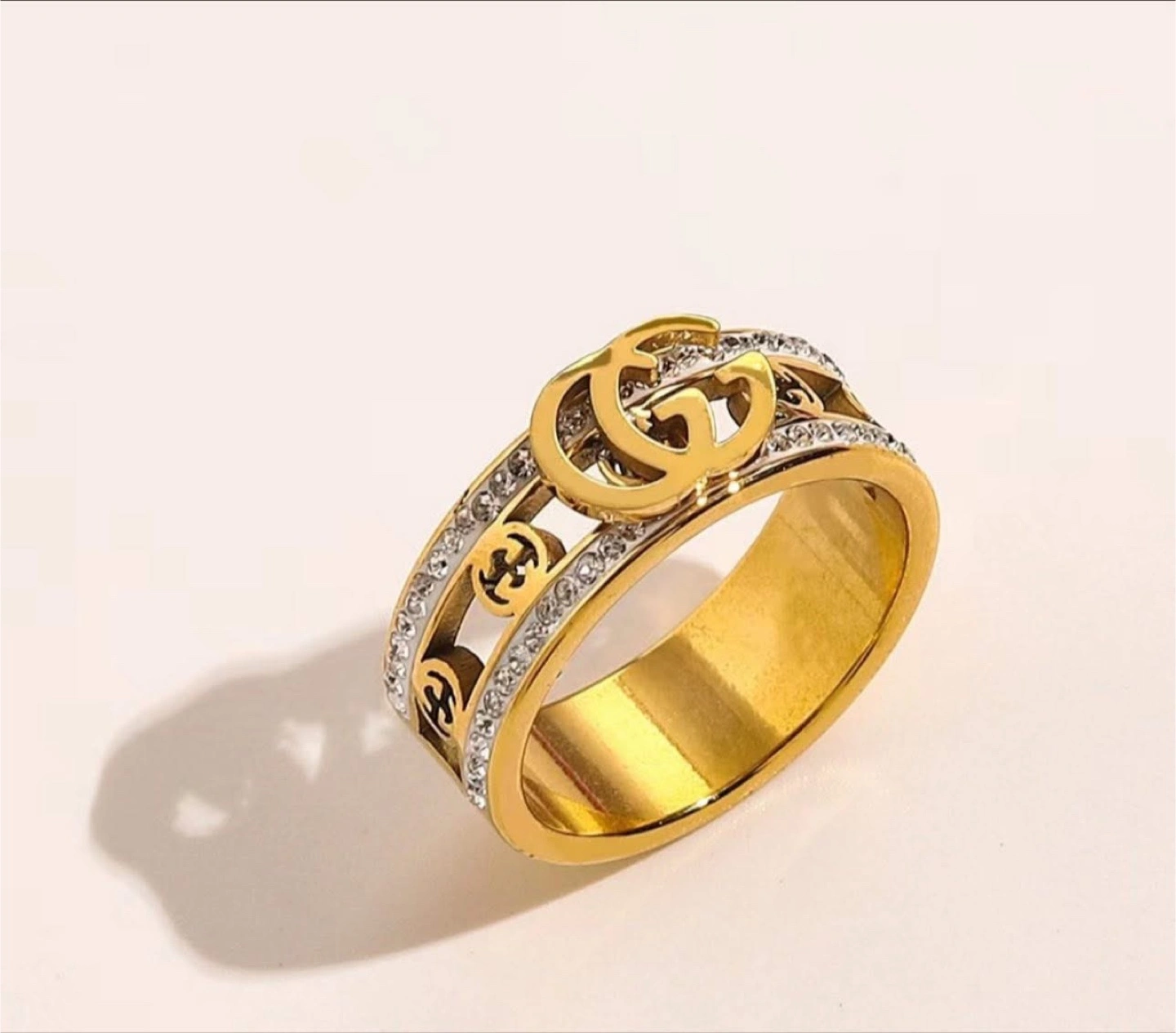 Selling a beautiful gold-colored Gucci ring. It features the iconic GG logo and is adorned with sparkling accents. A stylish accessory to elevate any outfit!