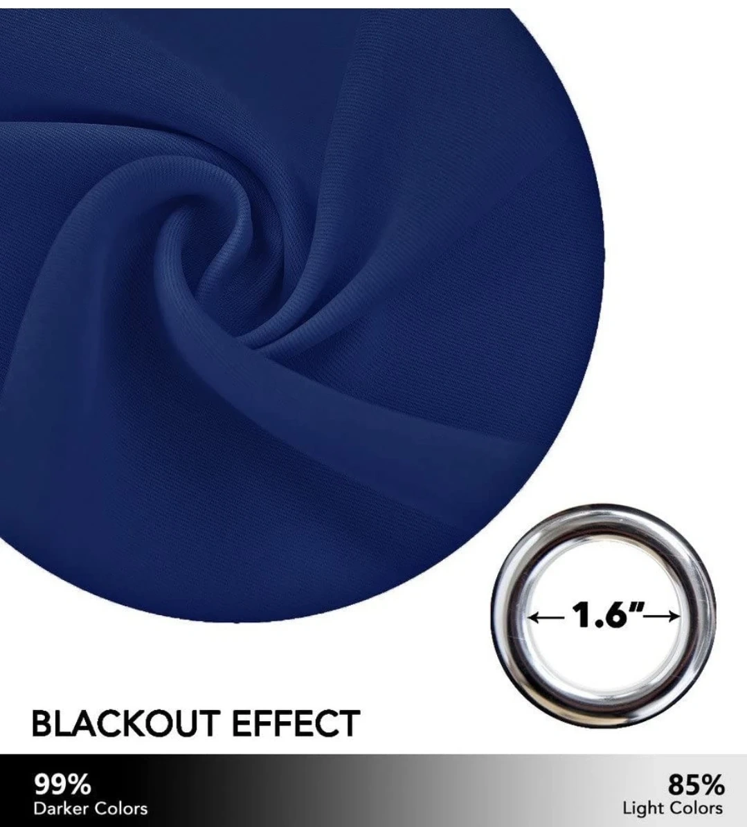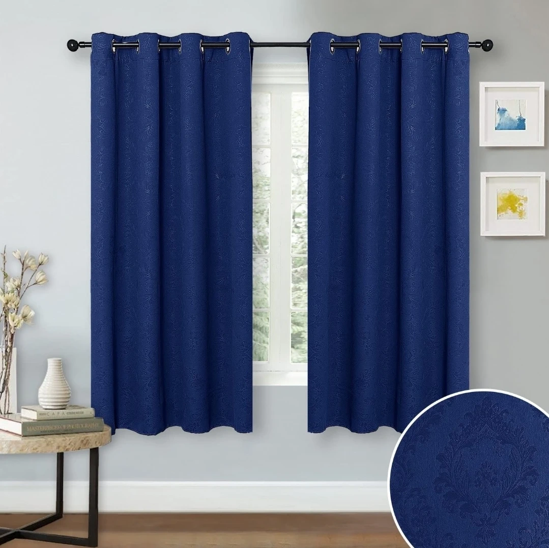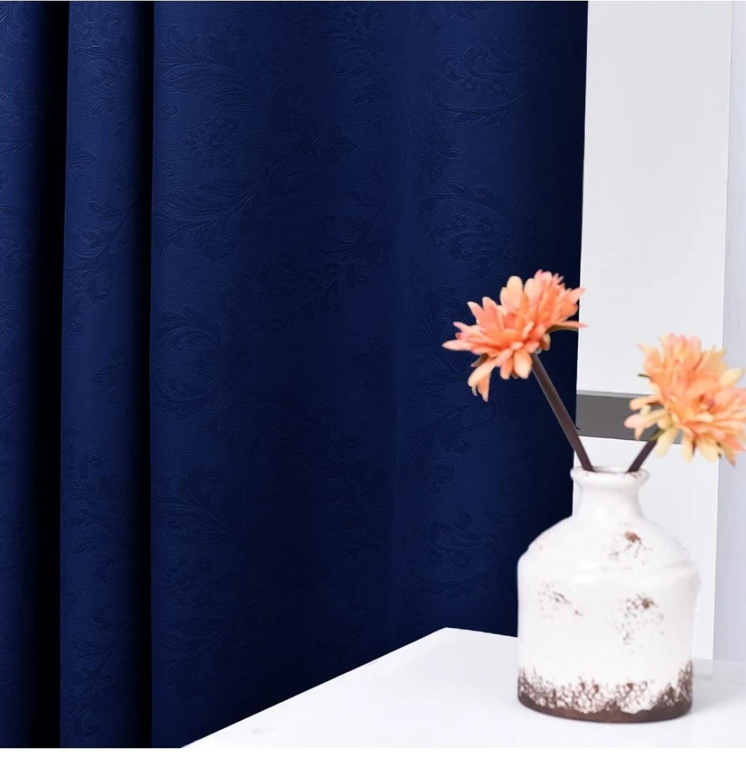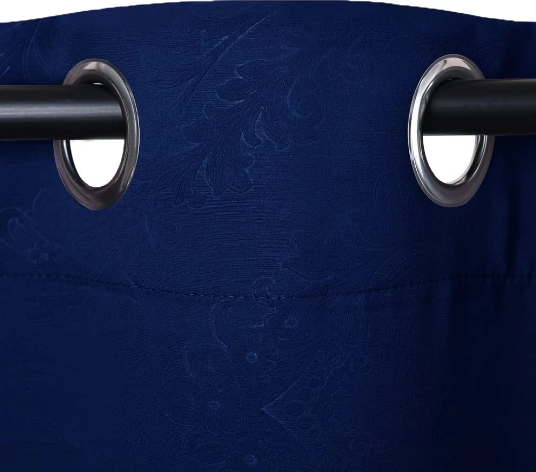 Set of two (2) thermal blackout curtains embossed with a damask print. Cobalt to navy in color, measuring 52" wide and 63" long.