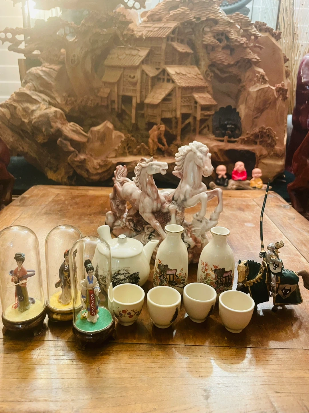This set includes a small white teapot, four small teacups, and two decorative vases. It also features a beautiful horse figurine sculpture. A unique collection for display!