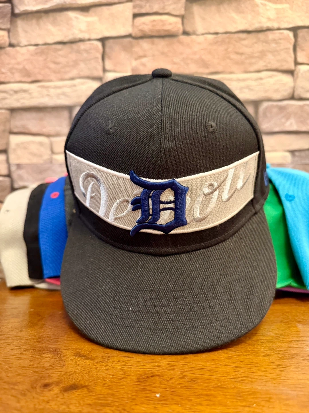 Black baseball cap with a white band featuring the 'Detroit' script and a blue 'D' logo. This cap is adjustable. It's perfect for any Tigers fan!