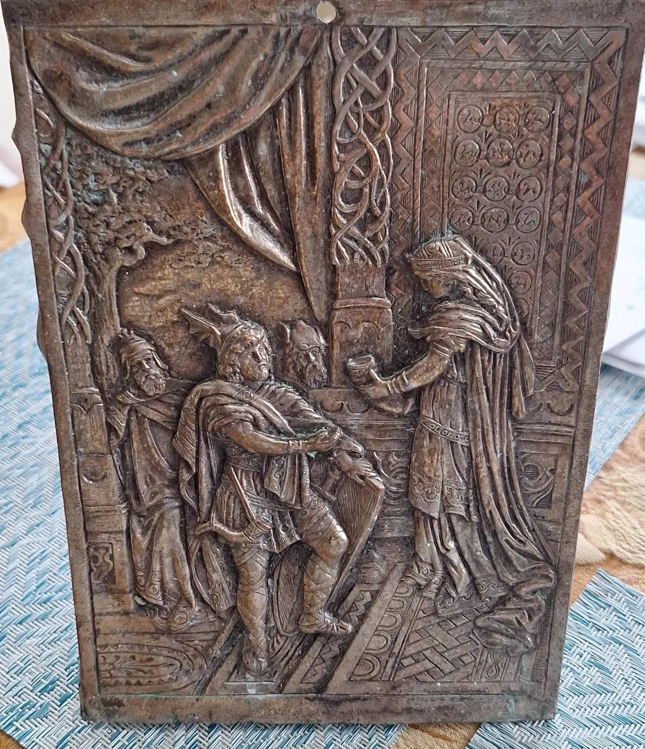 This is a bronze plaque featuring a detailed Viking scene. The artwork depicts figures in historical attire. It has a metallic finish and a hole at the top for hanging.
