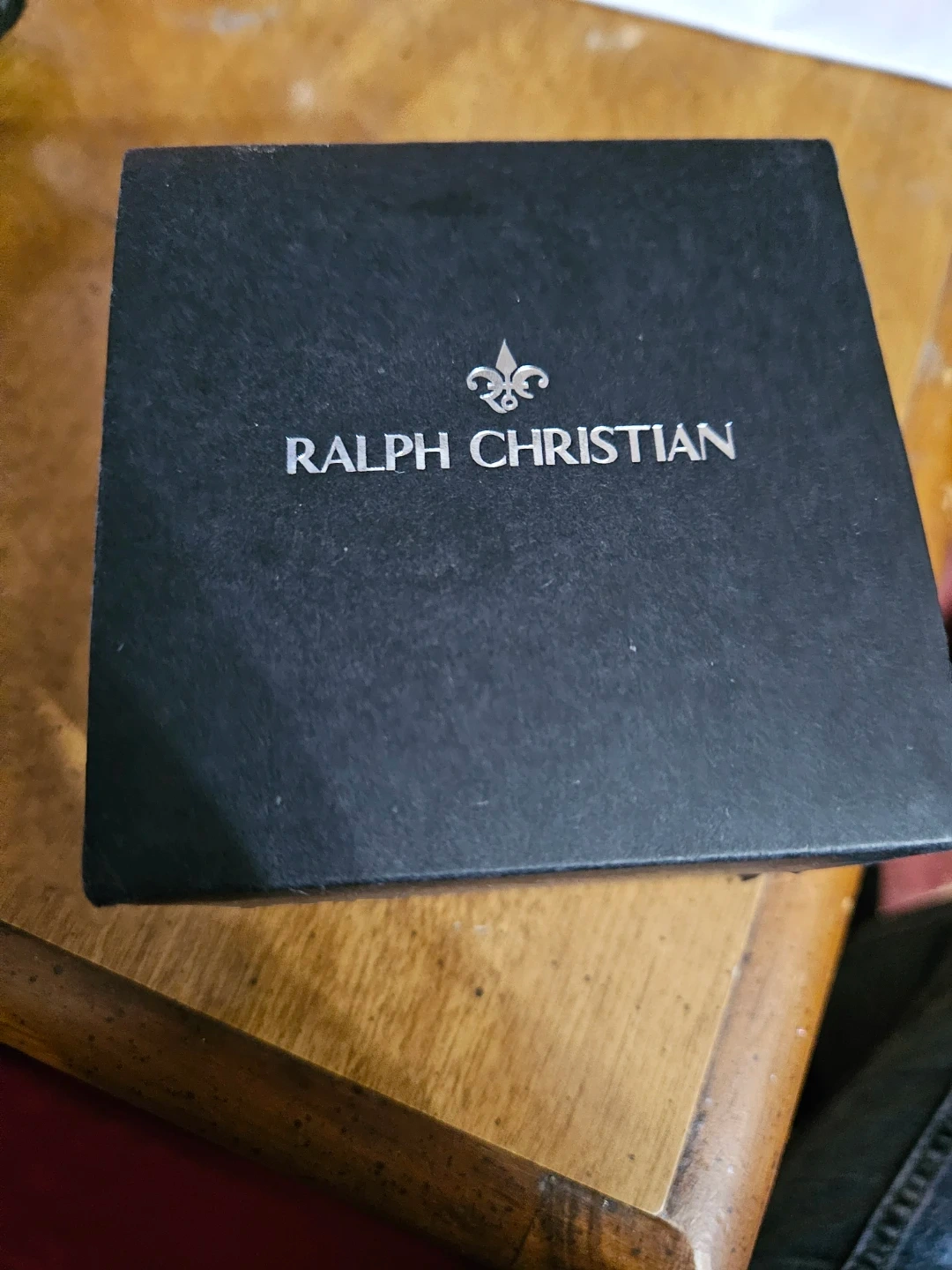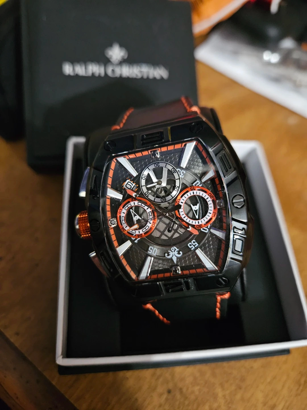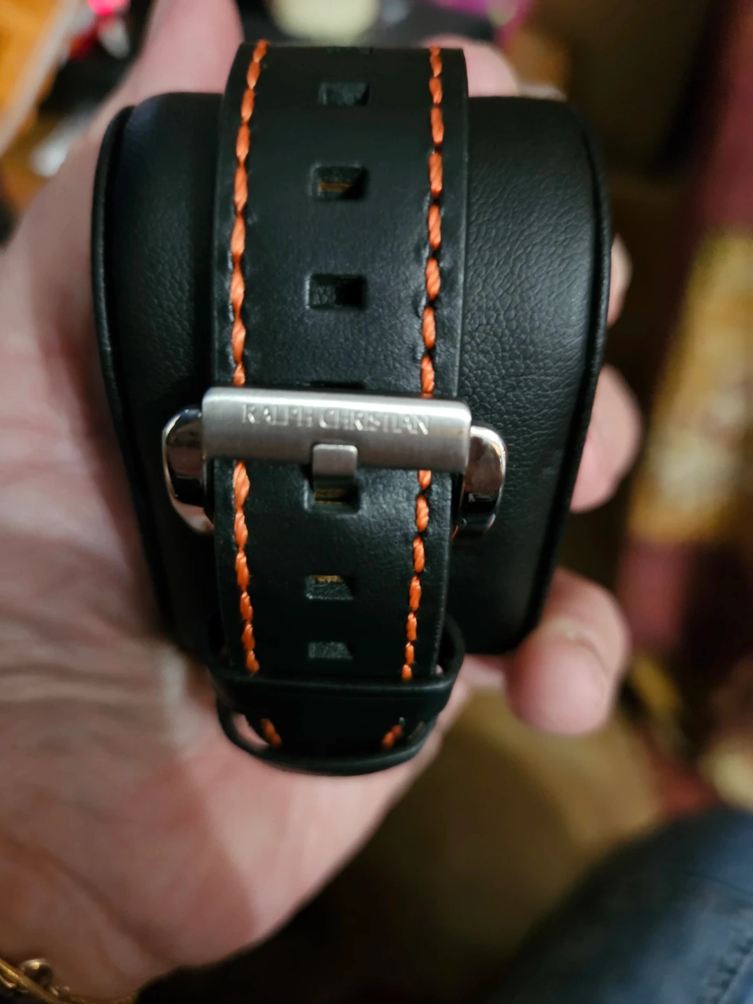 This is a Ralph Christian men's watch. It's black with orange stitching on the band. Includes the original box. A stylish timepiece for everyday wear!