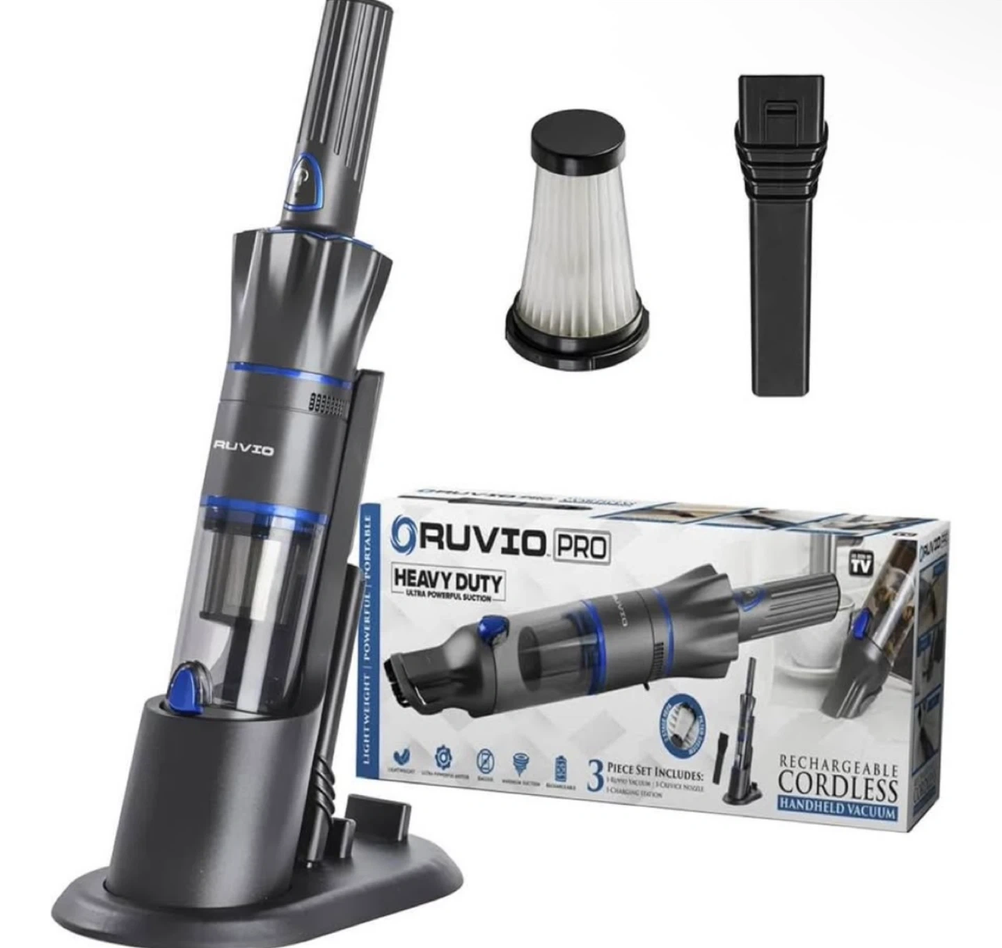 This is the Ruvio Pro Heavy Duty Cordless Handheld Vacuum. It's lightweight and portable with ultra-powerful suction. The set includes the vacuum, crevice nozzle, and charging station.
