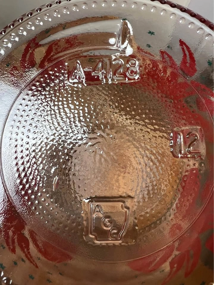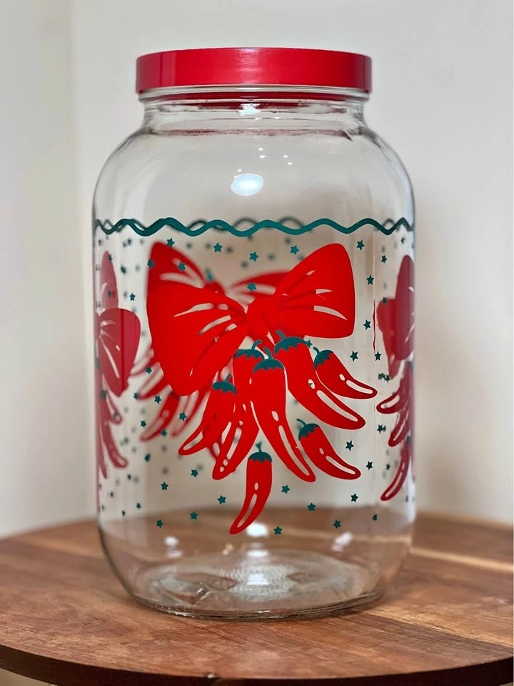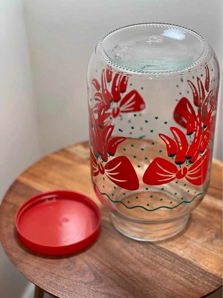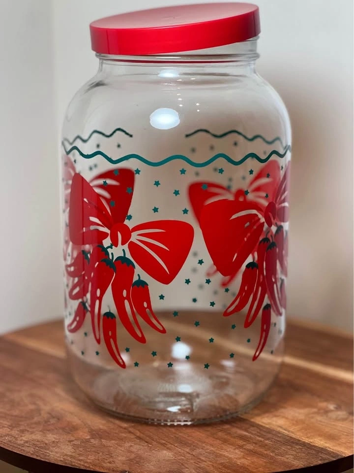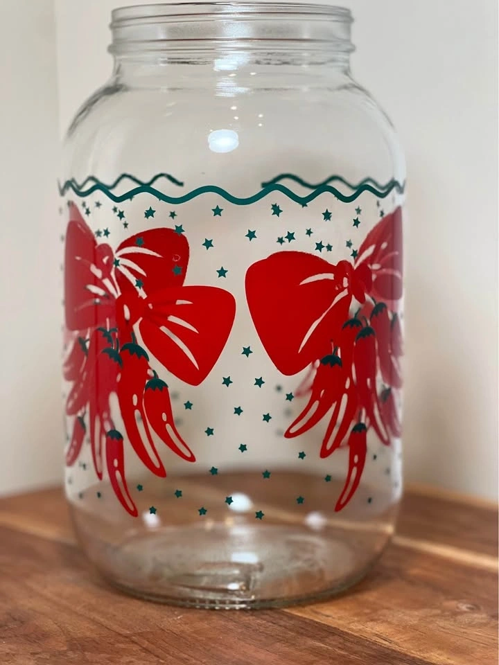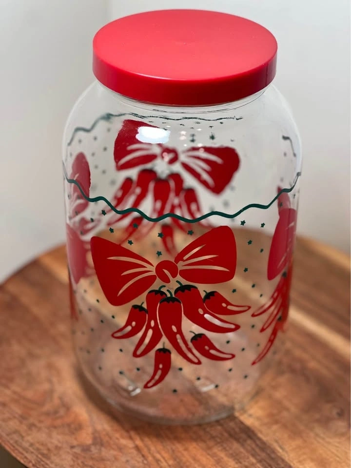 This is a vintage AGC (Anchor Glass Container) clear glass canister or sun tea jar. It features a festive red chili pepper and bow pattern with green accents, often associated with Southwestern or kitchen decor themes. The jar is clear glass with a red screw-on lid and typically holds 1 gallon, making it great for brewing sun tea. It was manufactured by Anchor Glass Container corporation, likely dating from the 1970s or 1980s. Preowned. Pickup is at 58th and 7th Ave in midtown Manhattan.