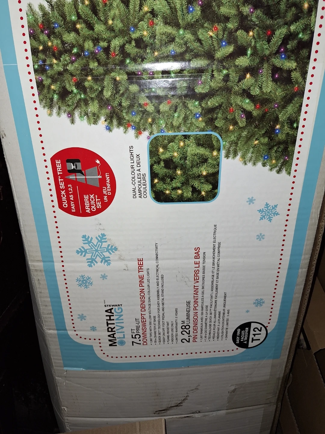 Save our tree! During the holidays we love sitting by it's beautiful glow. Hoping a new family or organization can enjoy it. We are downsizing and tree is too large. Martha Stewart 7.5ft Downswept Denison Pine Tree. It's pre-lit with dual-colour lights. It has a quick-set design for easy assembly and electrical connectivity. Comes with the original box. Easy to assemble. 3 pieces and plug in. Lights in working order. Price is negotiable.