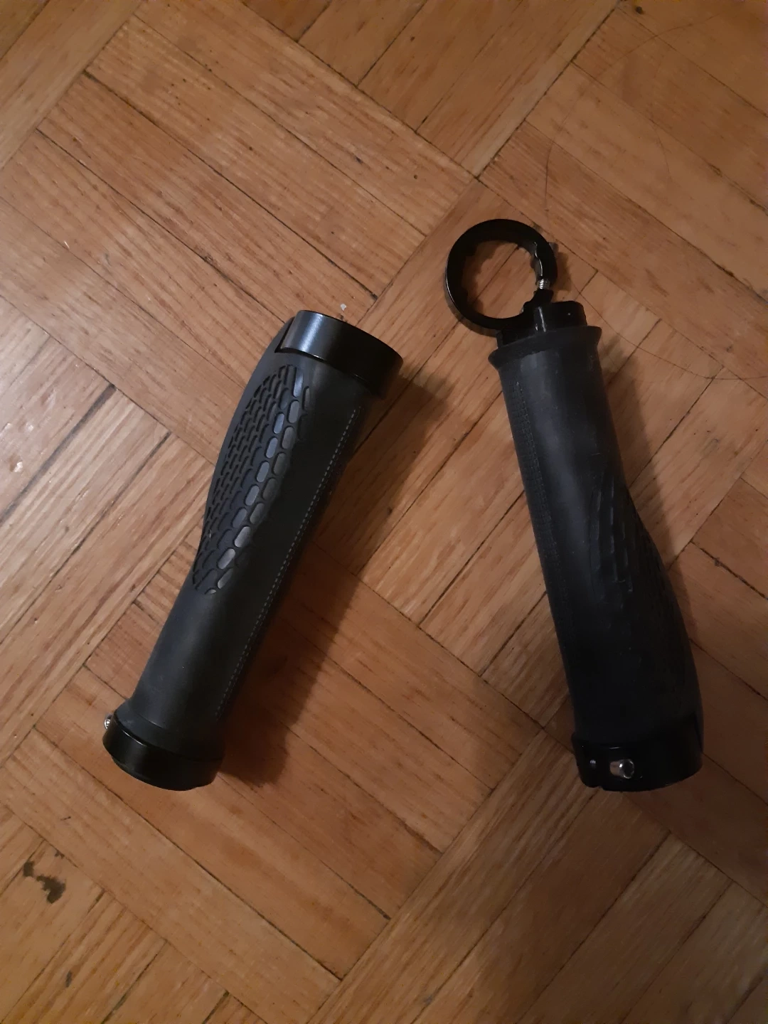 These are a pair of black bicycle handlebar grips. They're made of rubber with a textured pattern for better grip. The grips have metal end caps. They appear to be standard size for most handlebars. I bought them but didn't get to put them on.
