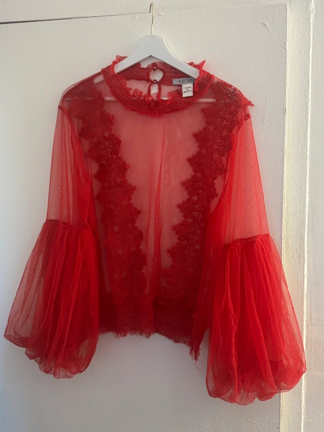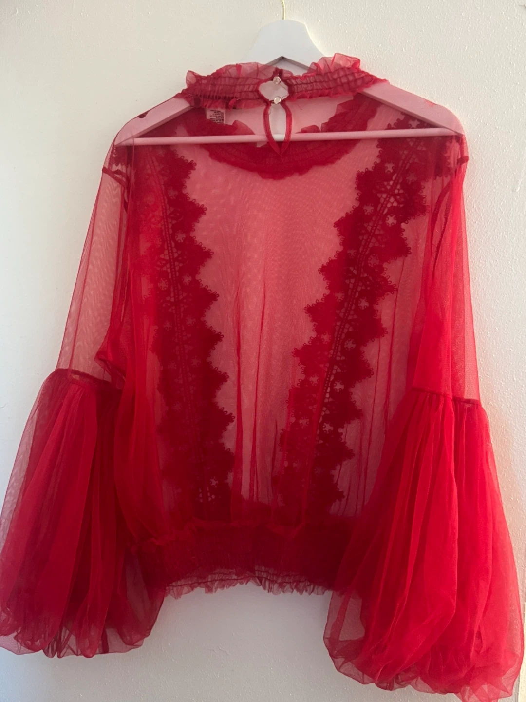 Sheer red top with ruffled mock neck and dramatic balloon sleeves. Features delicate lace trim down the front and a button closure at the back neck. It's made from a lightweight, sheer fabric.
