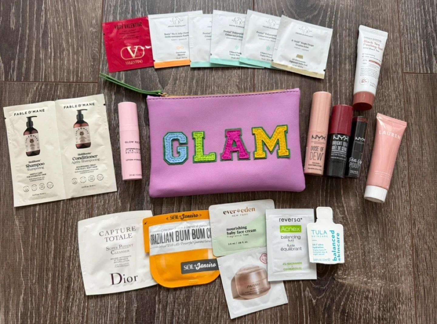 This collection includes a 'Glam' cosmetic bag filled with various makeup and skincare samples. You'll find items from Fable & Mane, Dior, Sol de Janeiro, NYX, and more. It's a great way to try out new beauty products!