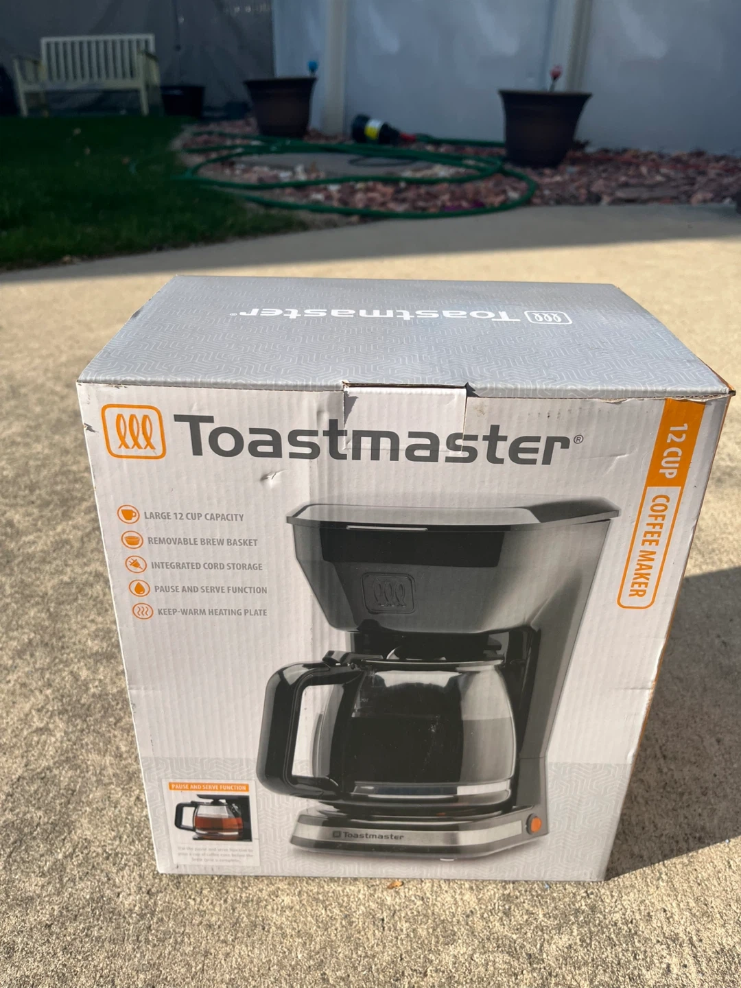 This is a Toastmaster 12-cup coffee maker. It has a large 12 cup capacity and a removable brew basket. Features integrated cord storage and a pause and serve function. The keep-warm heating plate maintains your coffee's temperature.