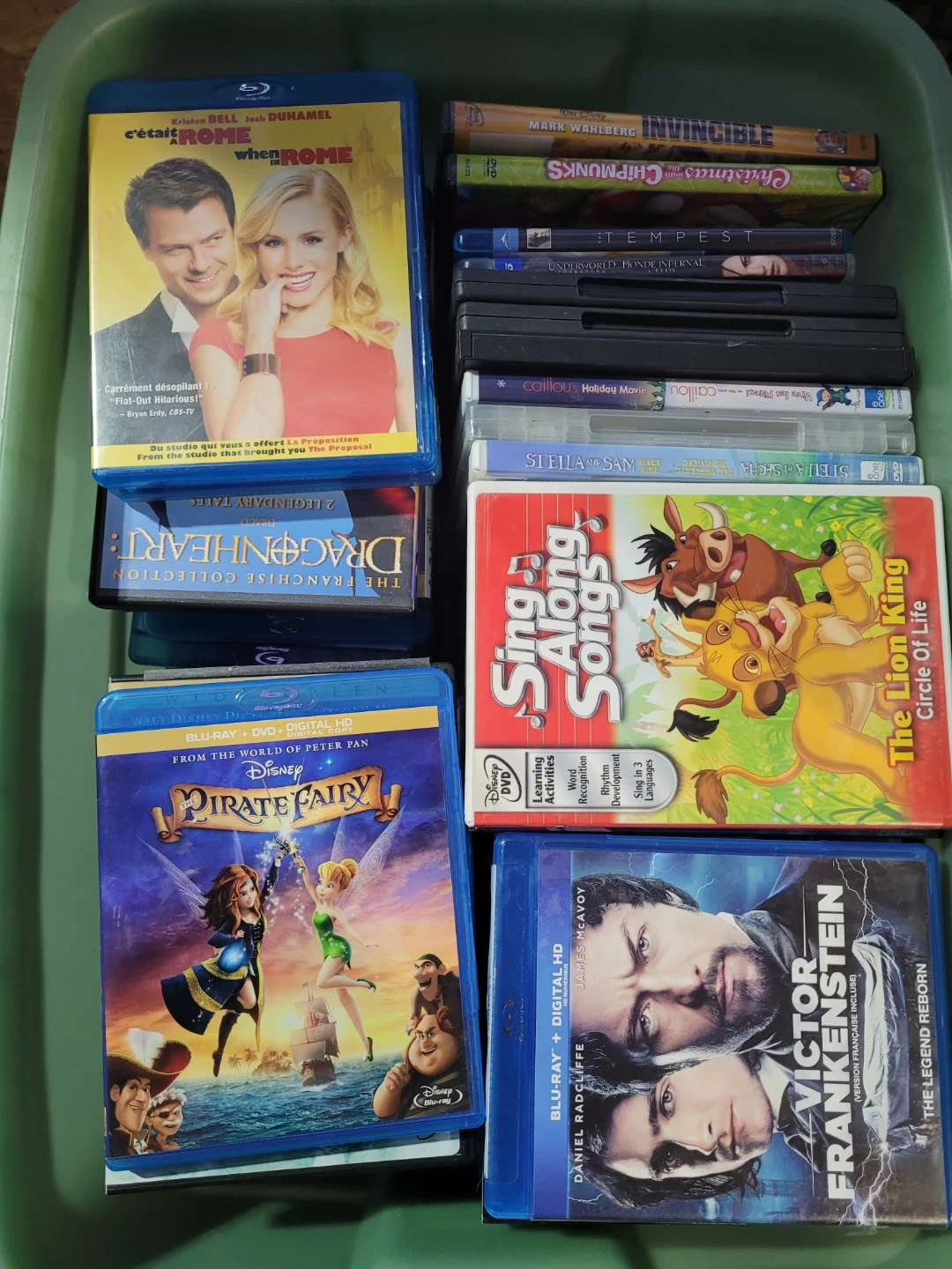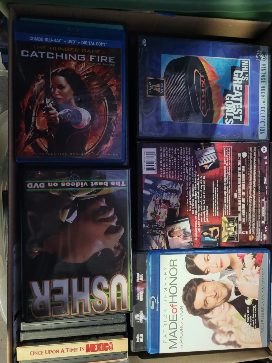 Selling a collection of approx 400-500 Blu-ray and DVD movies. Titles include The Hunger Games: Catching Fire, NHL's Greatest Goals, Usher videos, Made of Honor, Four Brothers, The Patriot, When in Rome, The Lion King, and Victor Frankenstein, plus many more! Great for expanding your movie collection