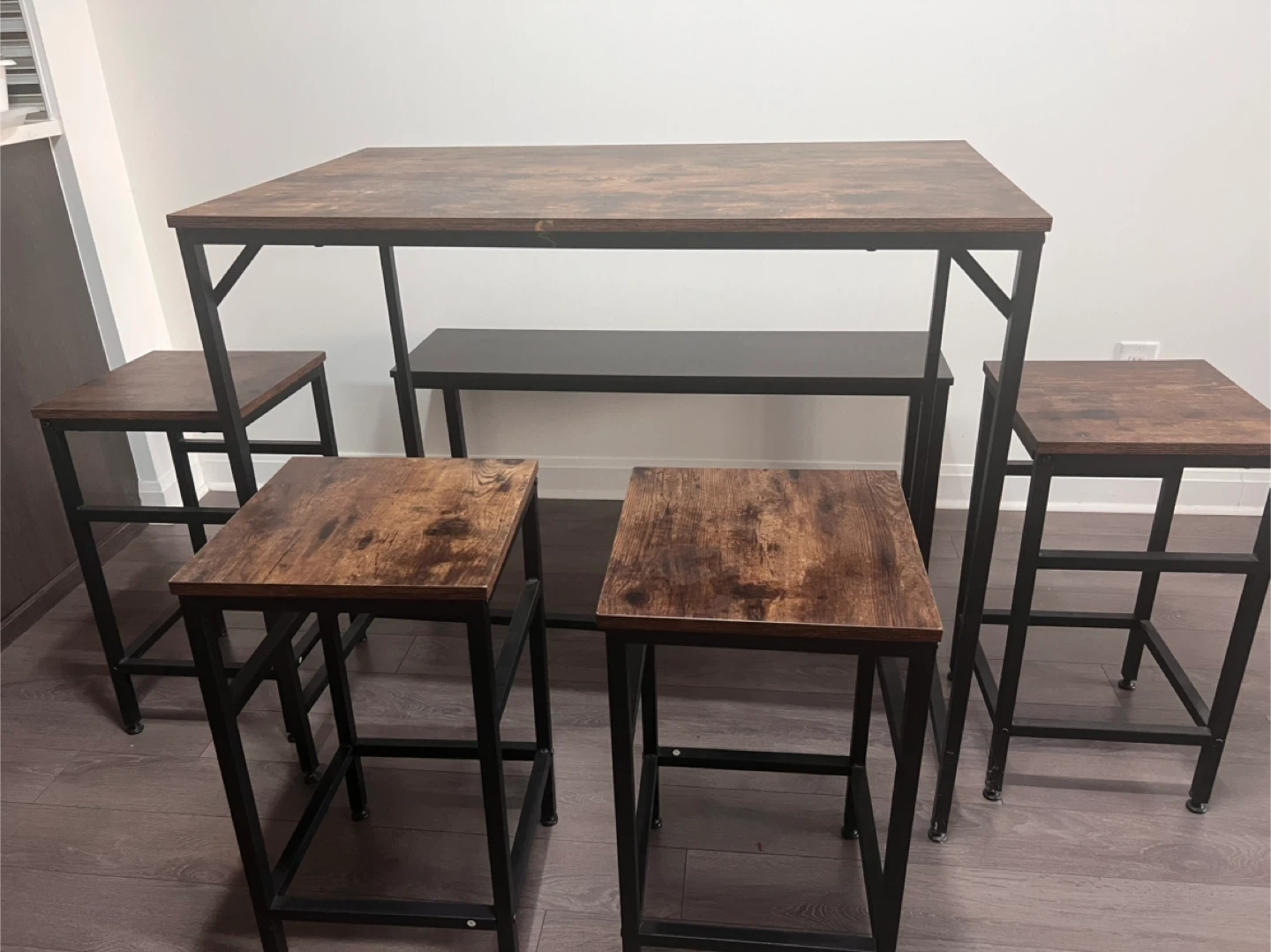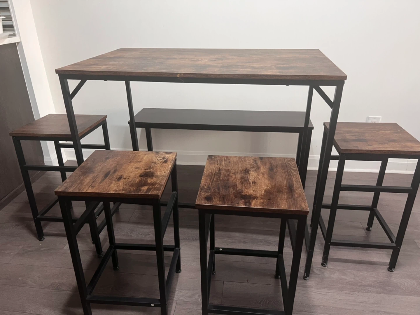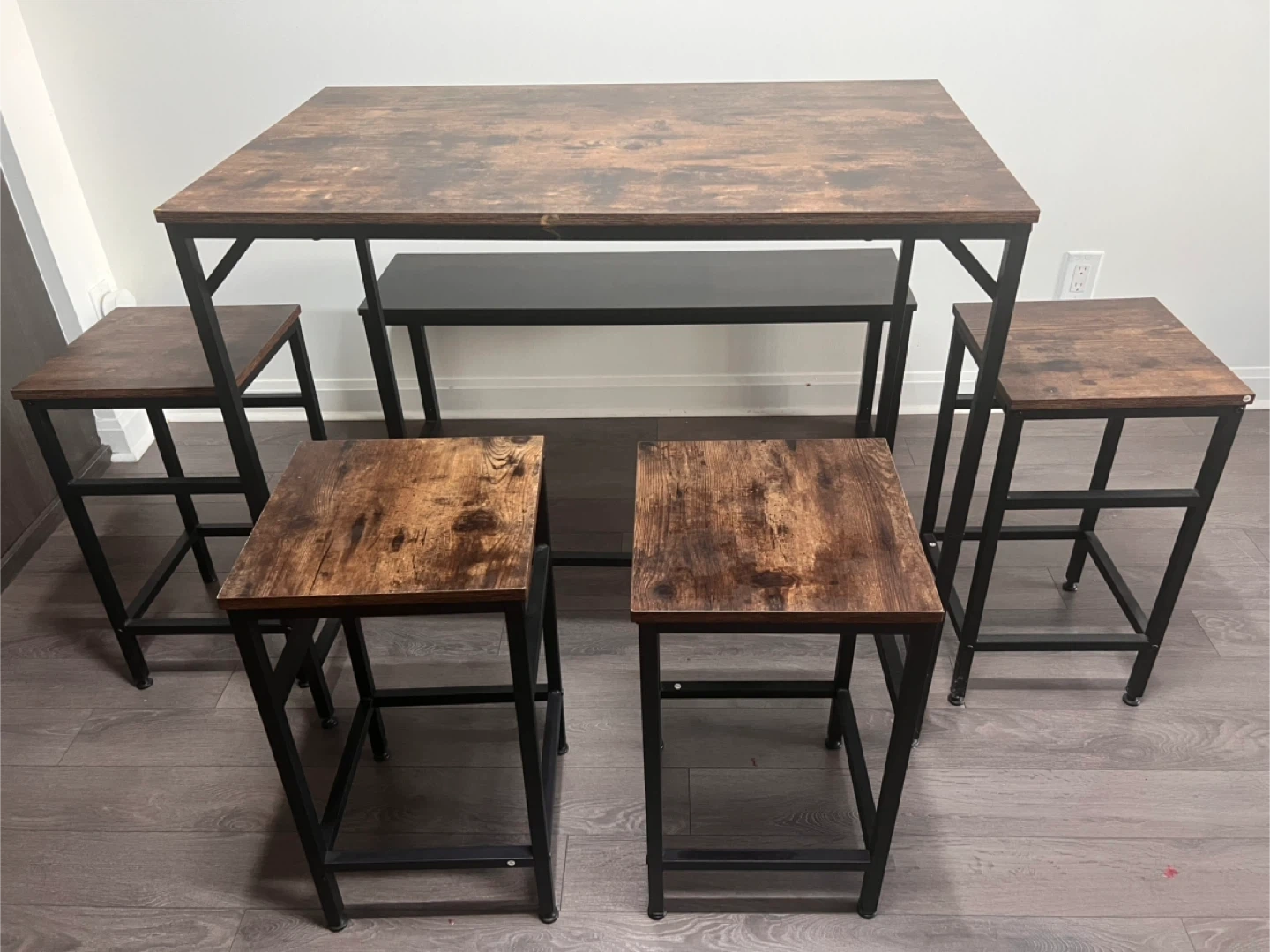 Selling a counter height dining set that includes a table, four stools, and a bench. The set has a rustic brown wood finish on the table and stools, with black metal frames. It's perfect for a smaller dining area or kitchen!