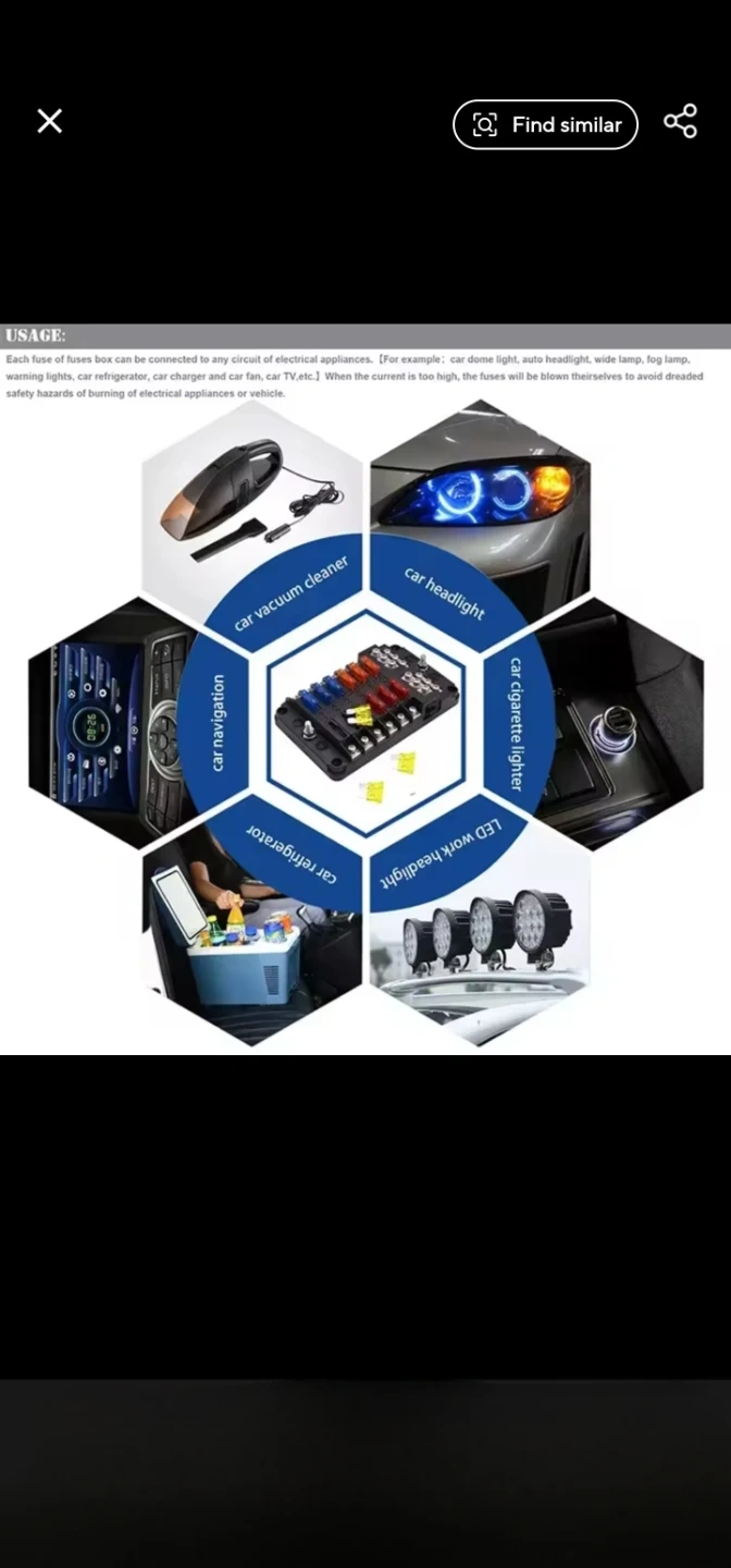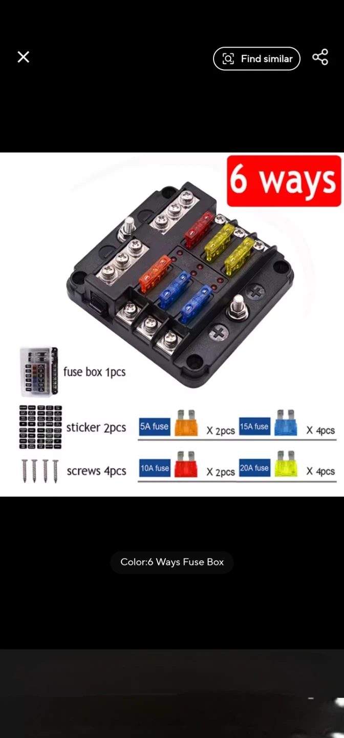 This fuse box has 6 circuits for various automotive applications. It includes 1pc fuse box, 2pcs stickers, 4pcs screws, and a set of fuses (2x 5A, 2x 10A, 4x 15A, 4x 20A). This unit's designed for easy installation and protection of vehicle electrical circuits.
