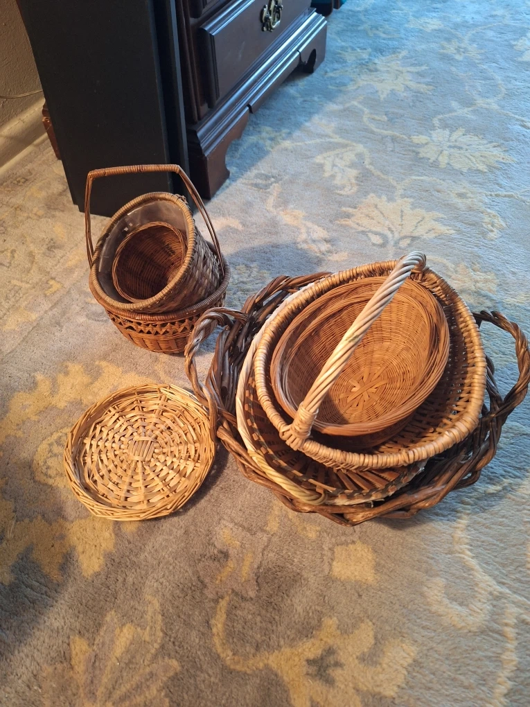 Set of decorative wicker baskets. Includes multiple sizes and shapes perfect for storage or display. One basket has a plastic liner.