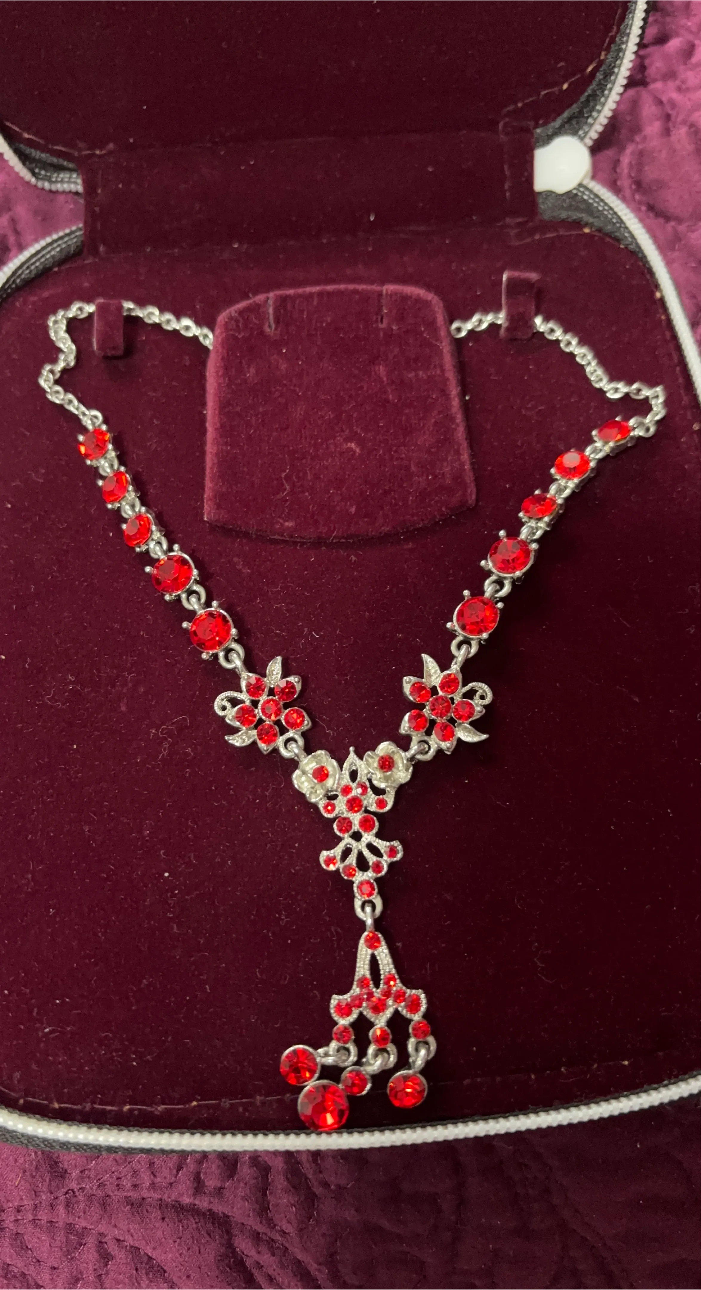 A delicate silver-tone necklace featuring a floral design with sparkling red gemstones. It has a chain closure and comes in a burgundy jewellery box. The necklace is a lovely accessory for special occasions!