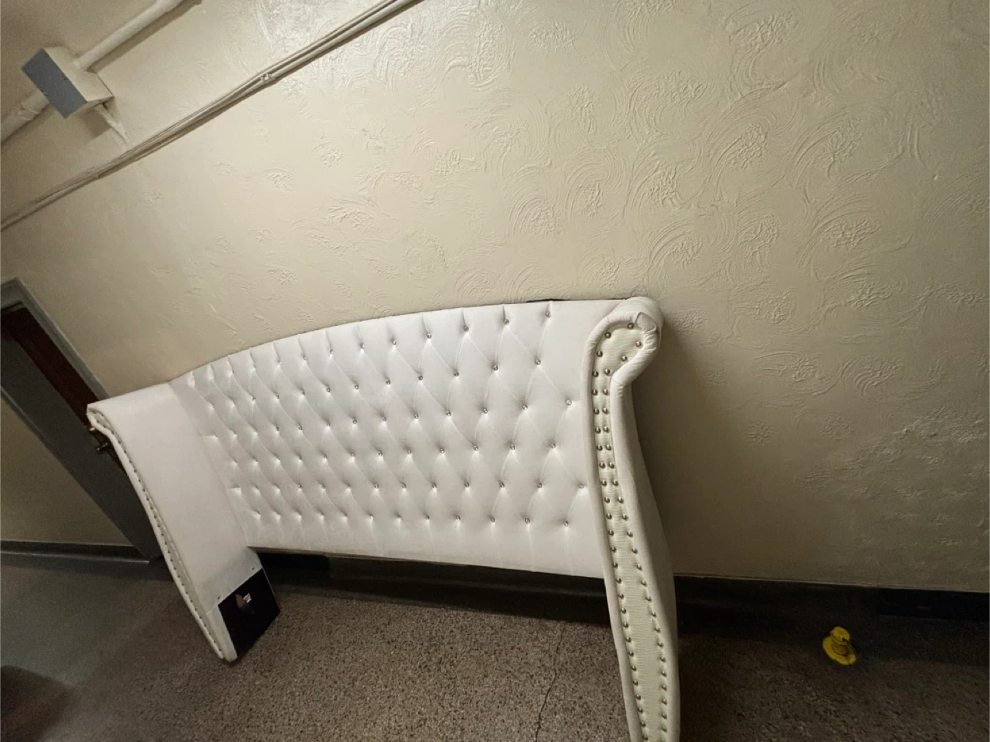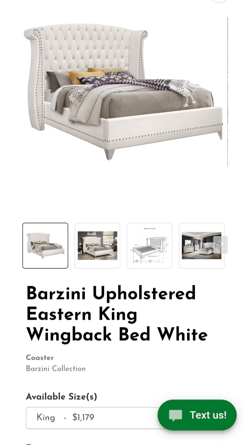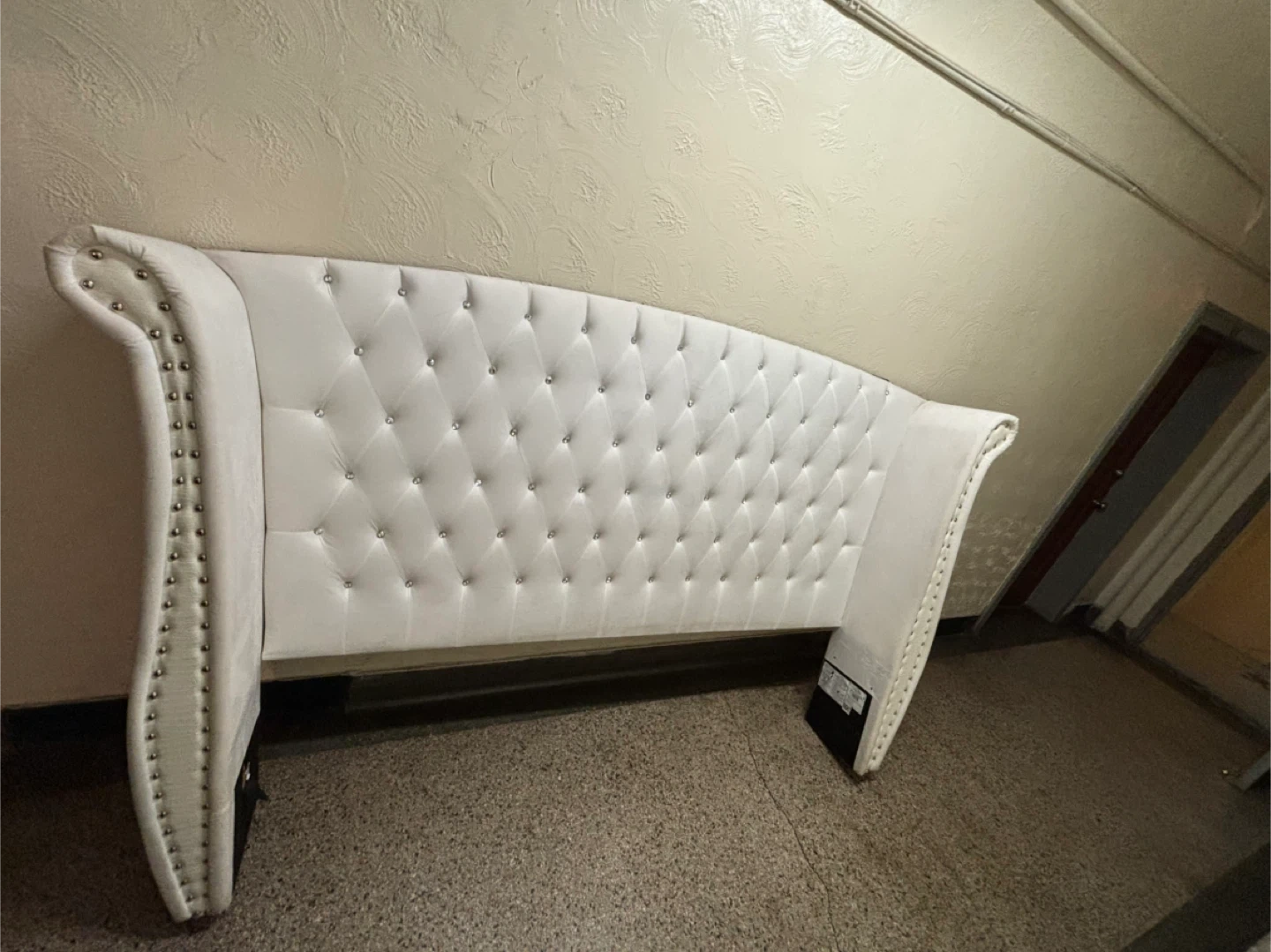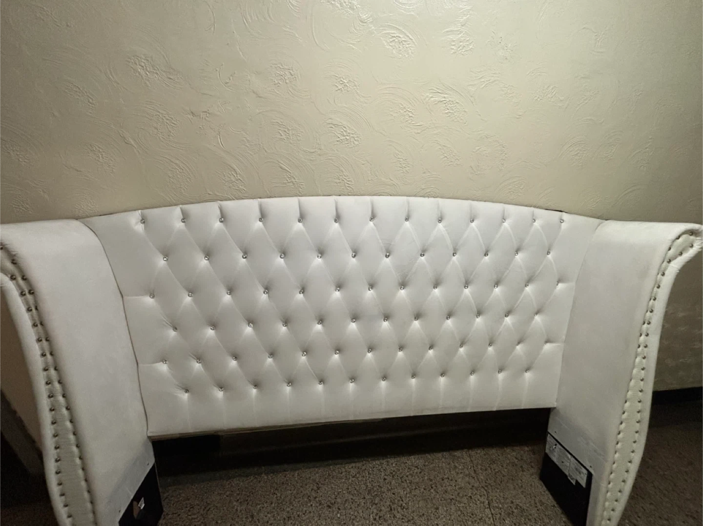 White upholstered Eastern King wingback headboard with diamond tufting and silver nailhead trim. This headboard provides a luxurious focal point for your bedroom. Headboard only, bed frame not included.