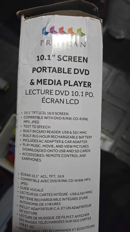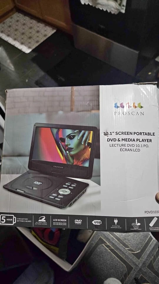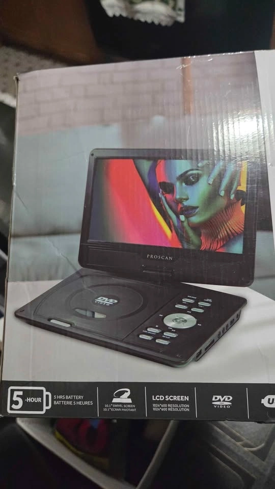 Portable Proscan 10.1" Portable DVD & Media Player. Has a 5-hour rechargeable battery, 10.1" swivel screen, and 1024x600 LCD screen resolution. Compatible with DVD R/RW, CD-R/RW, MP3, JPEG. Includes AC adapter, car adapter, remote control, and earphones. Built-in card reader for USB & SD/MMC too. Great for road trips! Everything is sold as is. Most items can be tested before purchase. Etransfer or cash accepted (no $50 or $100 bills). Located at Midland and Danforth in Scarborough.