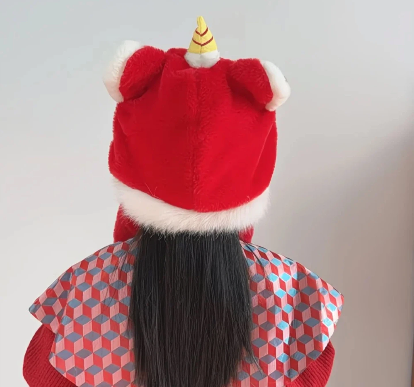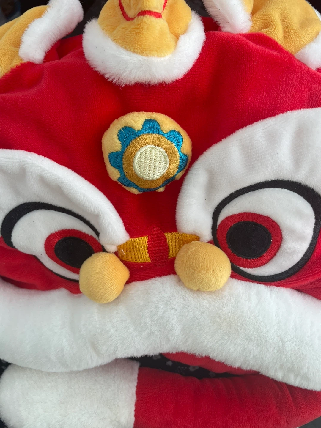 This fun red hat is designed to look like a lion dance costume. It's plush and soft with white fuzzy trim. It features long red tassels on the sides and a yellow horn on top. Kids love wearing these for celebrations!