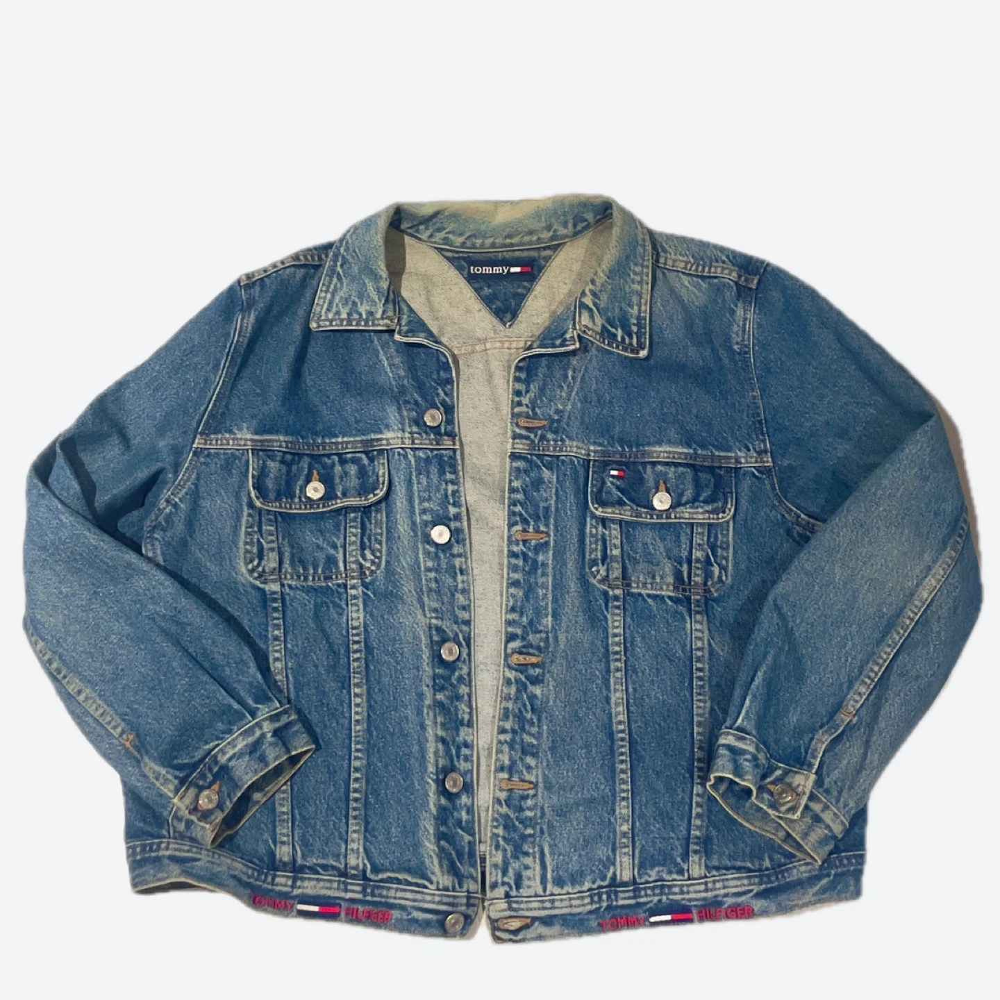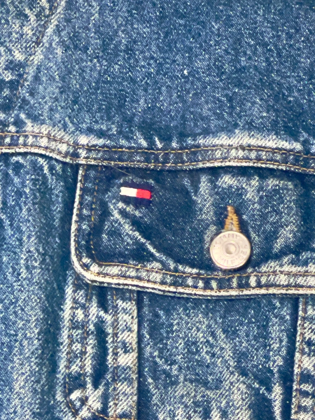 Tommy Hilfiger vintage denim jacket. It's made of 100% cotton, perfect for layering or wearing on its own. It has a classic denim look with the Tommy Hilfiger logo details. A great addition to any wardrobe!