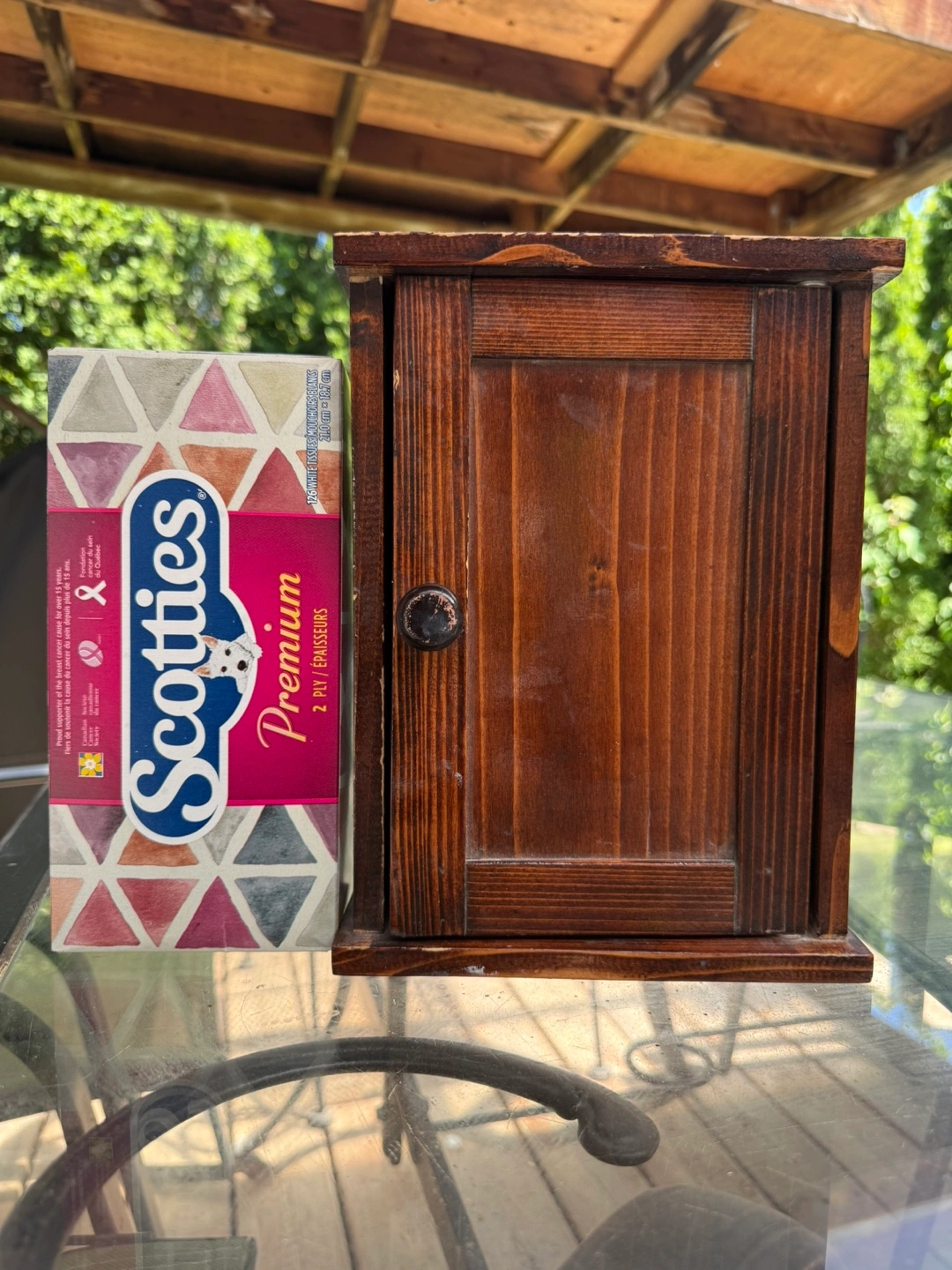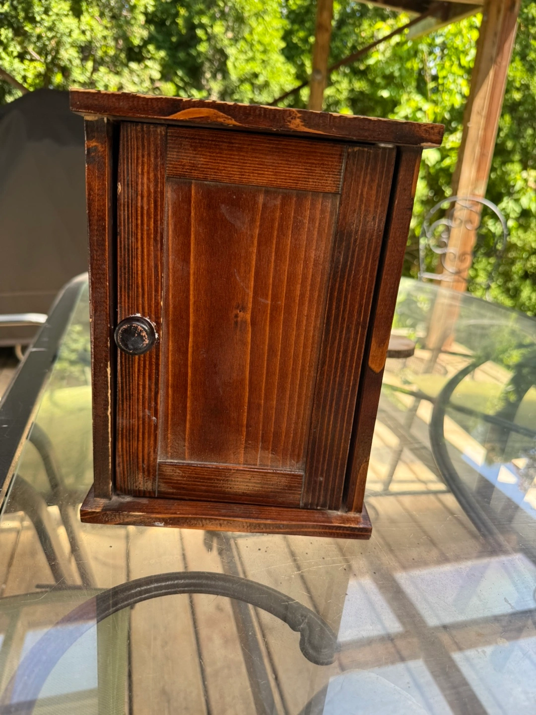 Small wooden key holder cabinet. Features a single door and multiple hooks inside. Dark brown stain. Perfect for organizing keys. Cash only