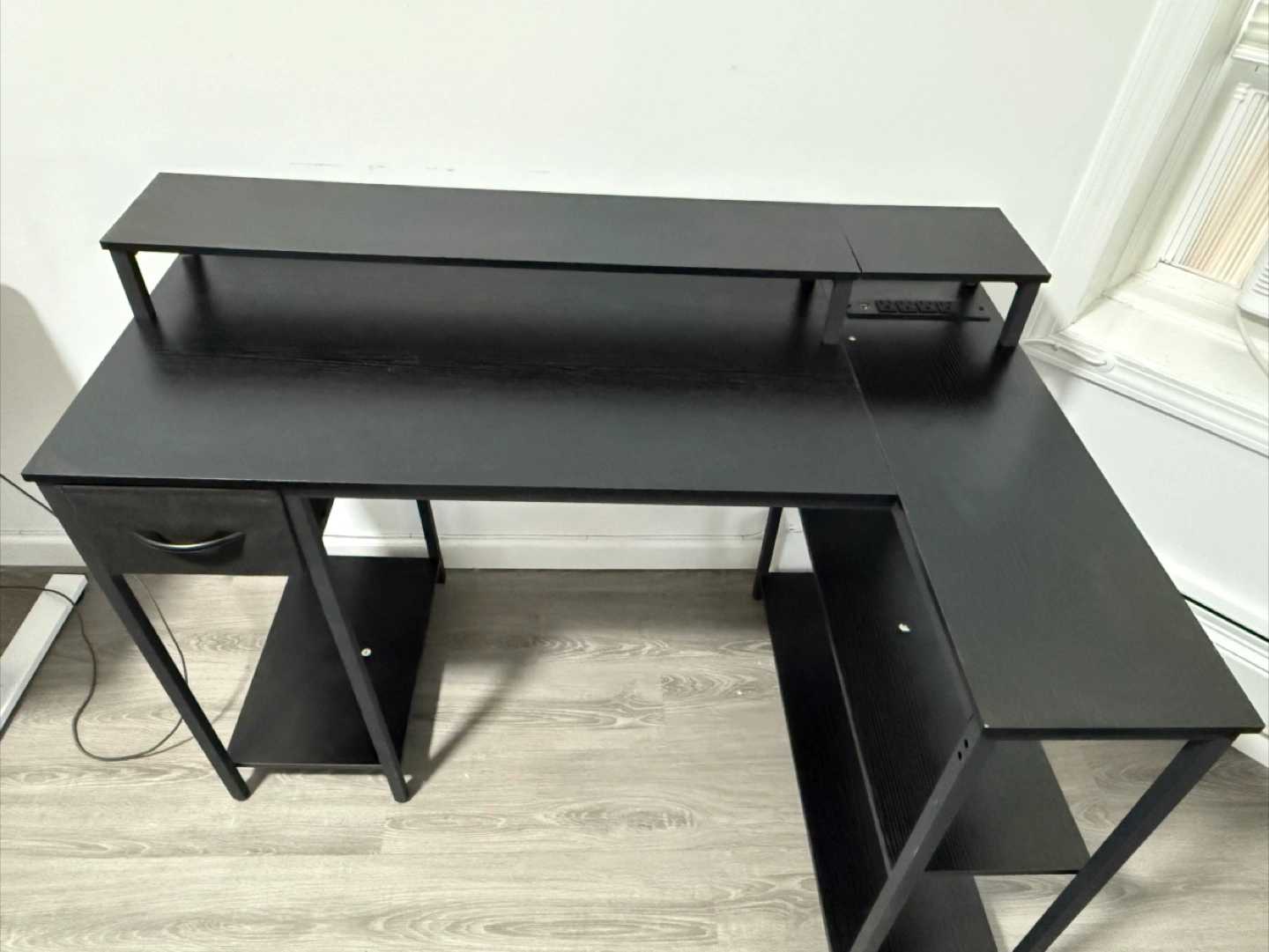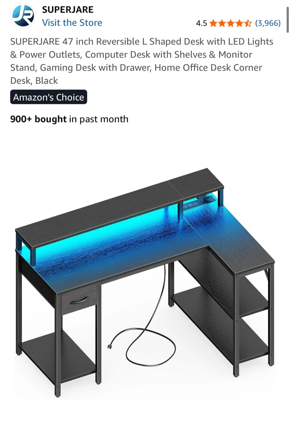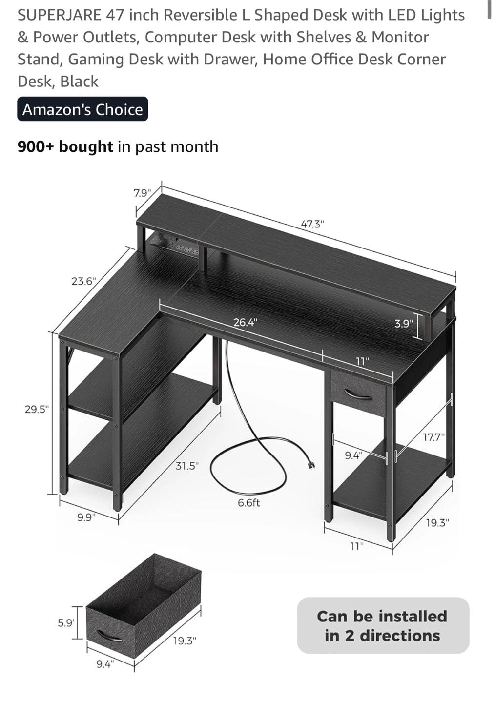 Selling a SUPERJARE 47 inch L-shaped desk in black It features LED lights, power outlets, shelves, a monitor stand, and a drawer. Great for a gaming desk or home office corner desk. Dimensions are 47.3" x 29.5" x 23.6".