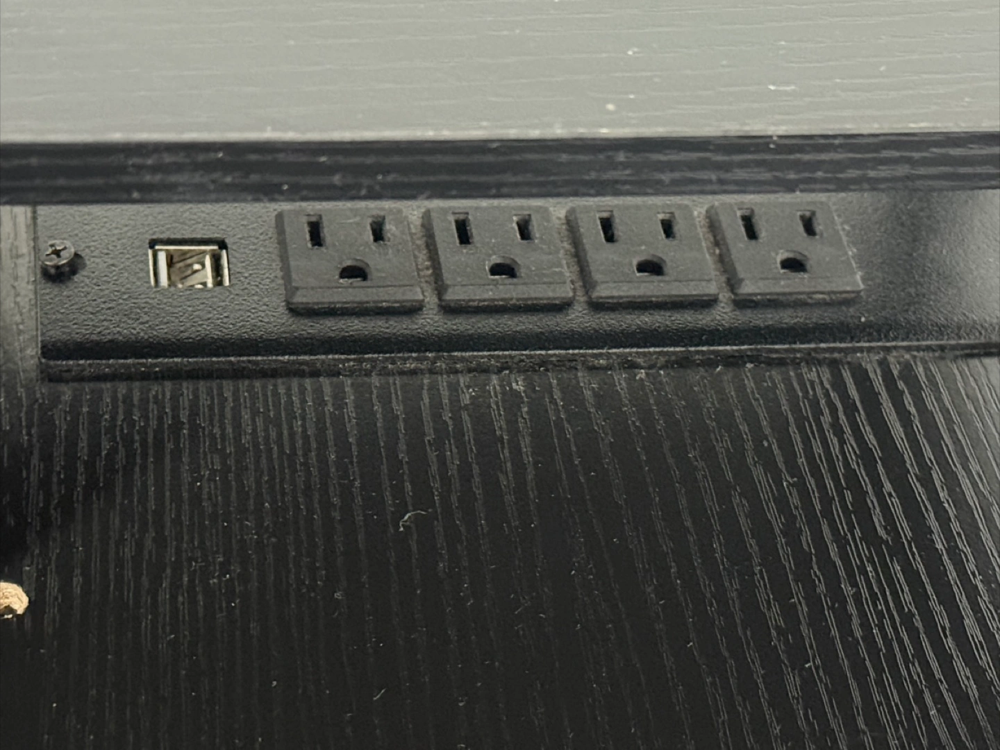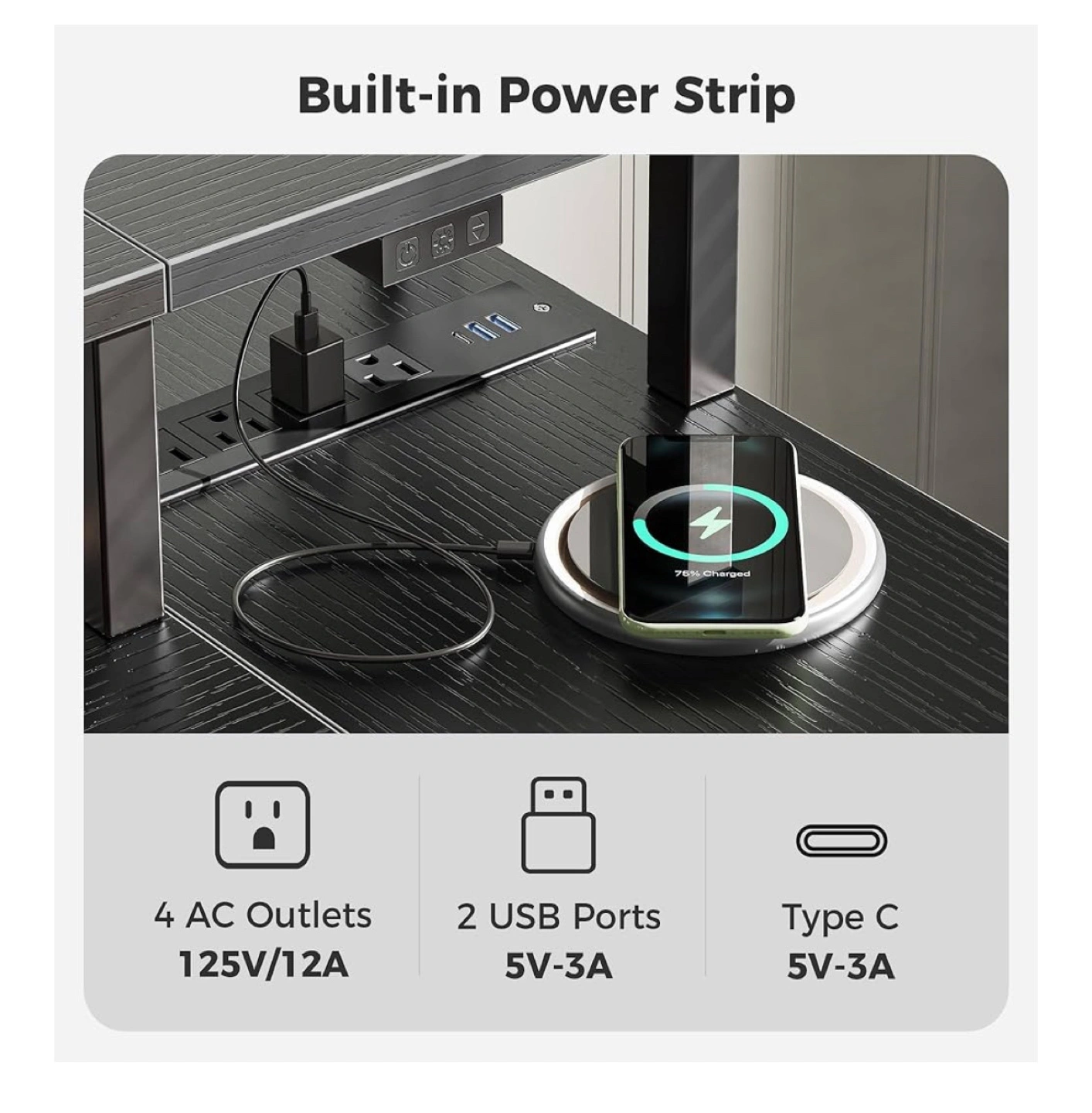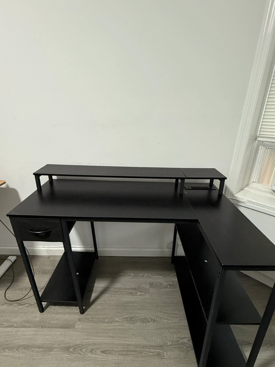 Selling a SUPERJARE 47 inch L-shaped desk in black It features LED lights, power outlets, shelves, a monitor stand, and a drawer. Great for a gaming desk or home office corner desk. Dimensions are 47.3" x 29.5" x 23.6".