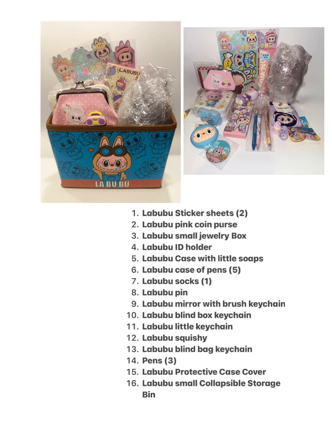 I'm selling a cute Labubu gift basket filled with fun items! It includes: - 2 Labubu sticker sheets - A pink Labubu coin purse - A small Labubu jewelry box - Labubu ID holder - A Labubu case with little soaps - A Labubu case for pens (5) - A pair of Labubu socks - Labubu pin - Labubu mirror with brush keychain - Labubu blind box keychain - A Labubu little keychain - Labubu squishy - Labubu blind bag keychain - 3 pens - Labubu protective case cover - Labubu small collapsible storage bin