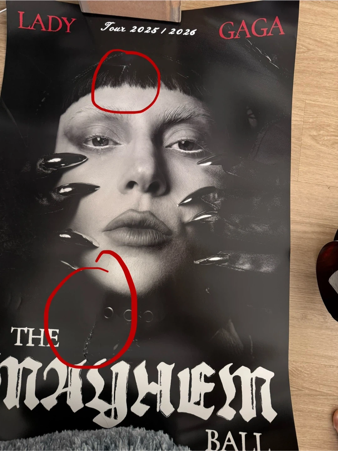 Selling a Lady Gaga "The Mayhem Ball" tour posters. They were damaged in transit (circled in red) but I think they’re too pretty to throw away ✨