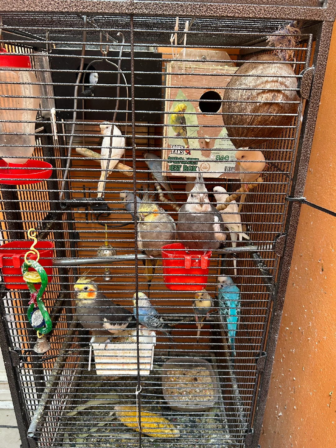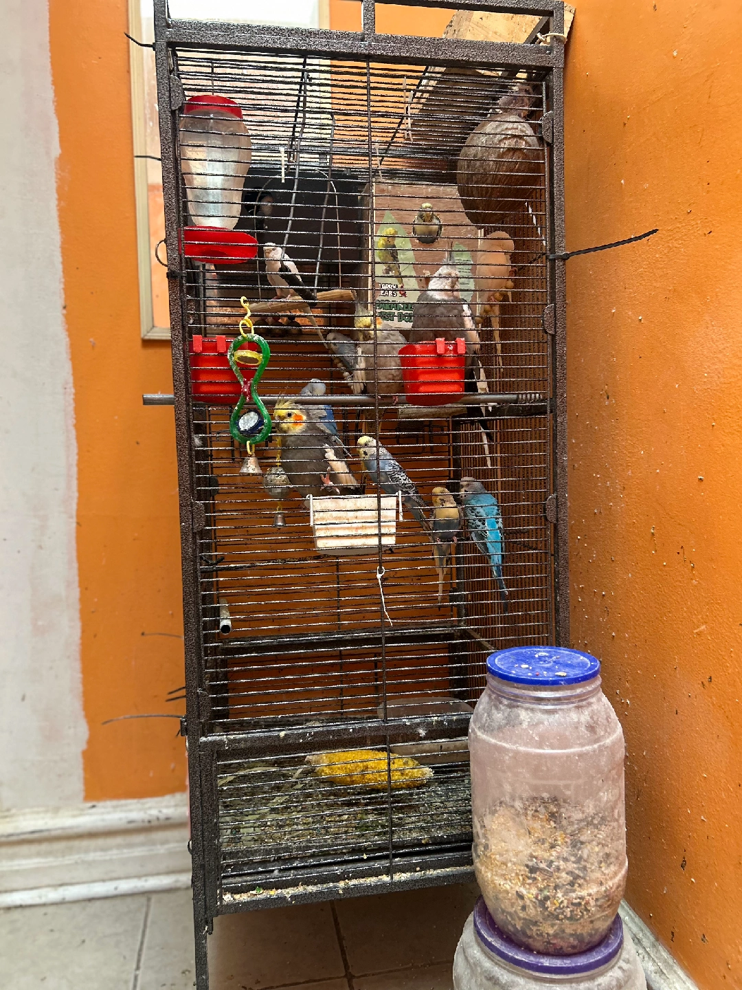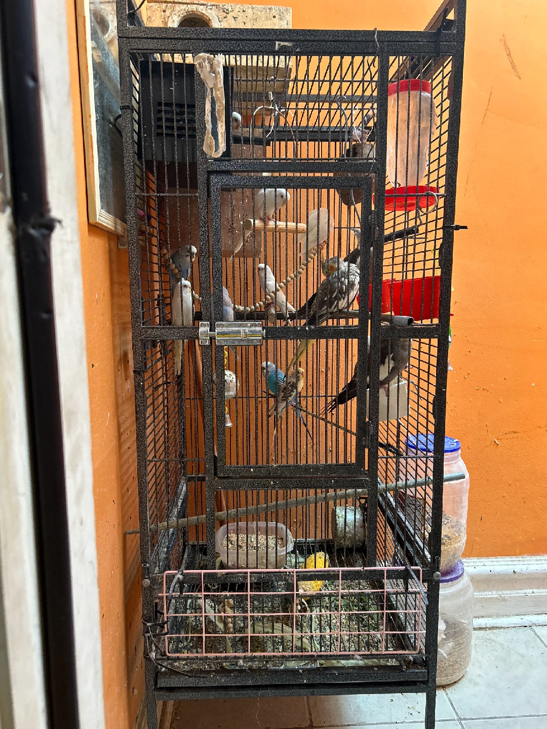 Selling a large bird cage that can house multiple birds. It includes perches, feeders,and some toys for your feathered friends. The cage is in good condition and ready for a new home for your birds!