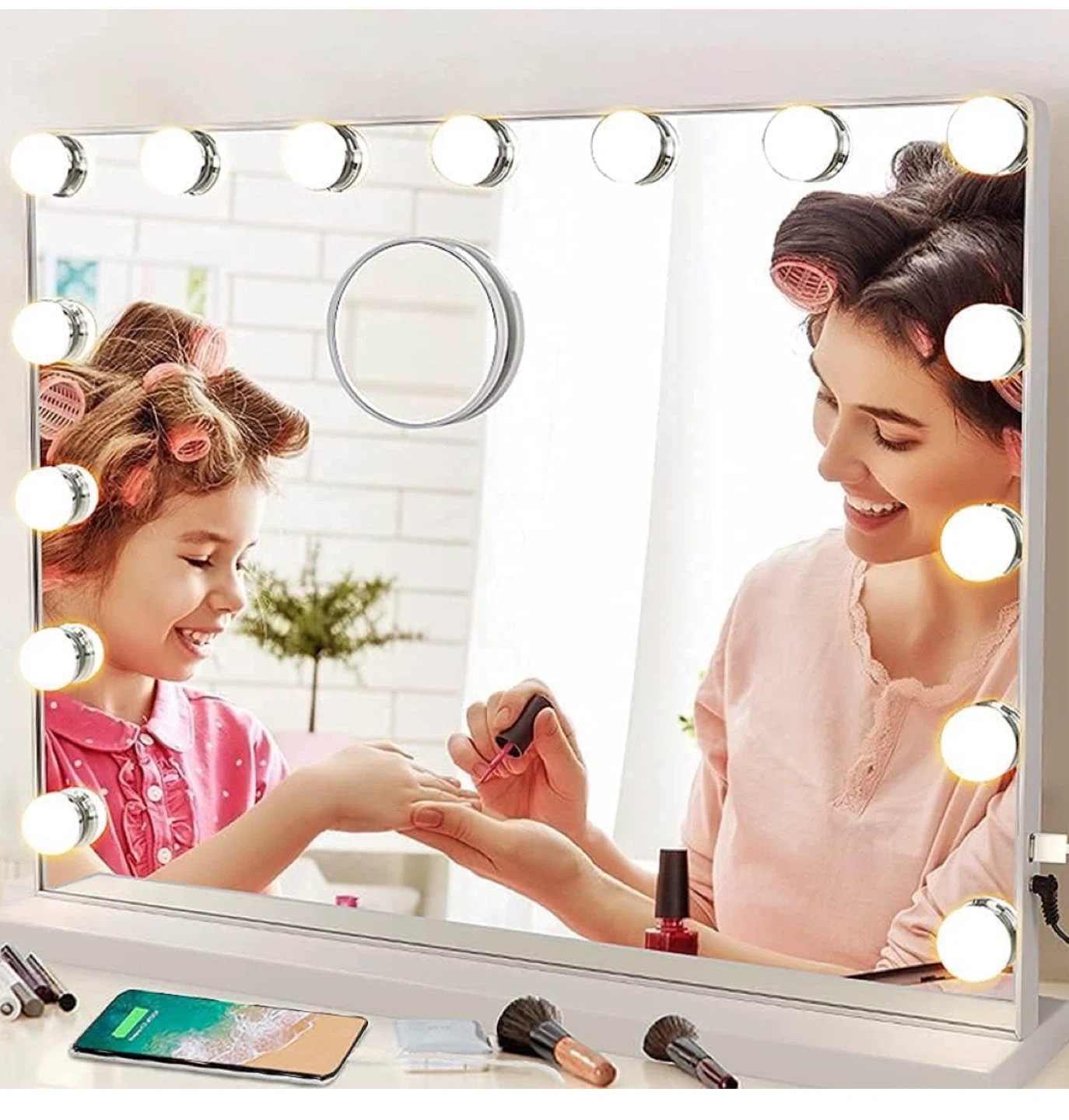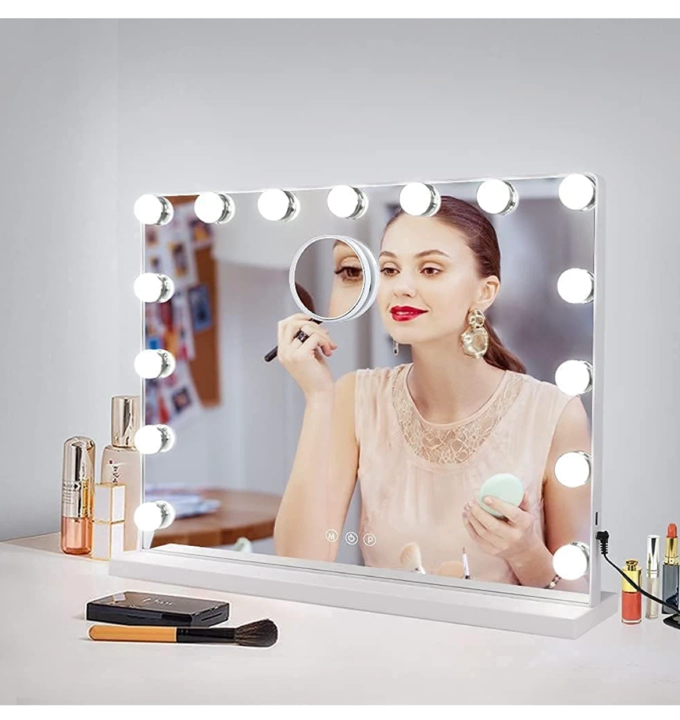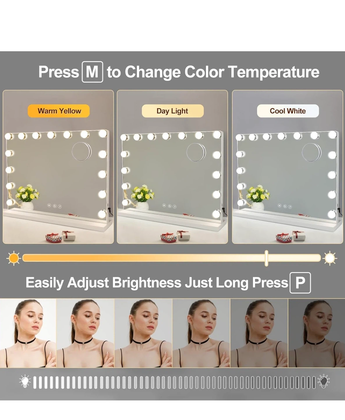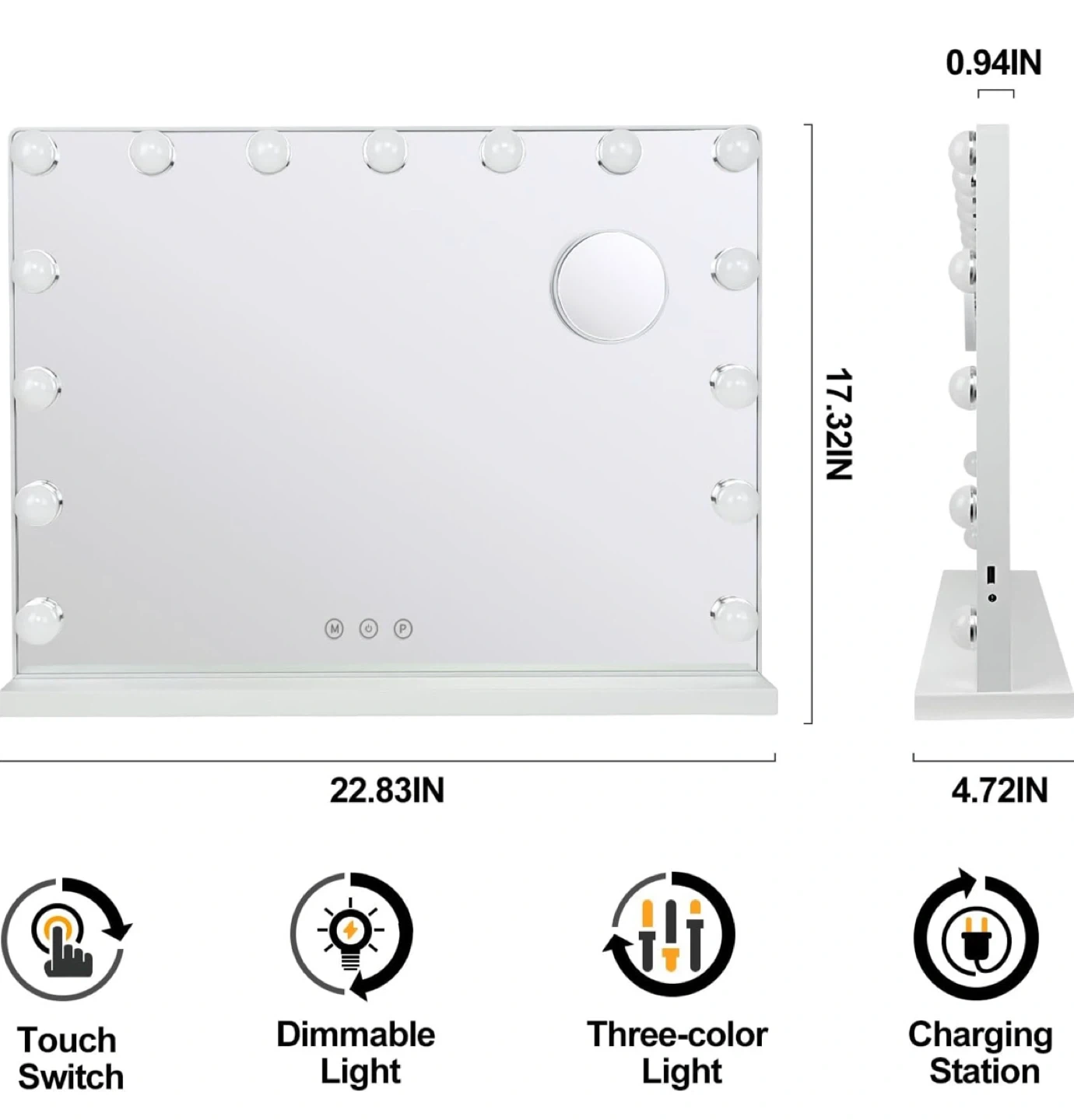 Selling a vanity mirror with lights! It features a touch switch, dimmable light, and three-color light settings (warm yellow, day light, and cool white). You can easily adjust the brightness by long-pressing the P button. The mirror also has a charging station. Dimensions are 22.83in x 17.32in x 4.72in