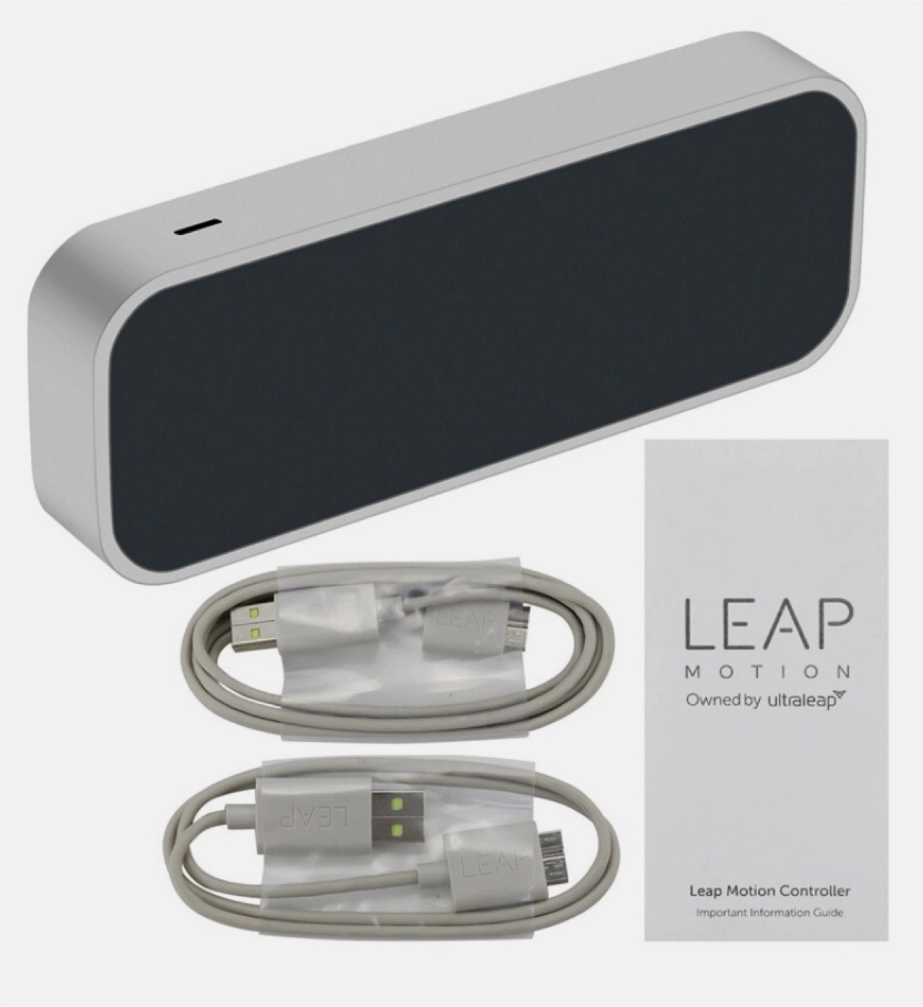 Silver and dark gray Leap Motion Controller. Includes two USB cables and instruction manual. Only used once.