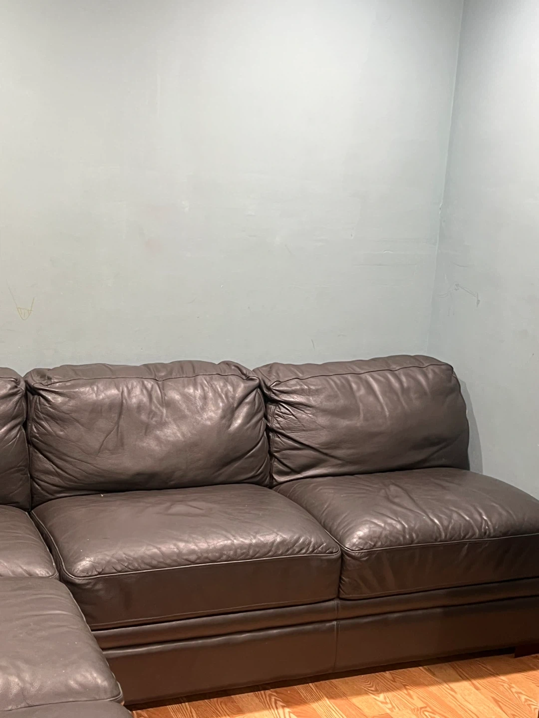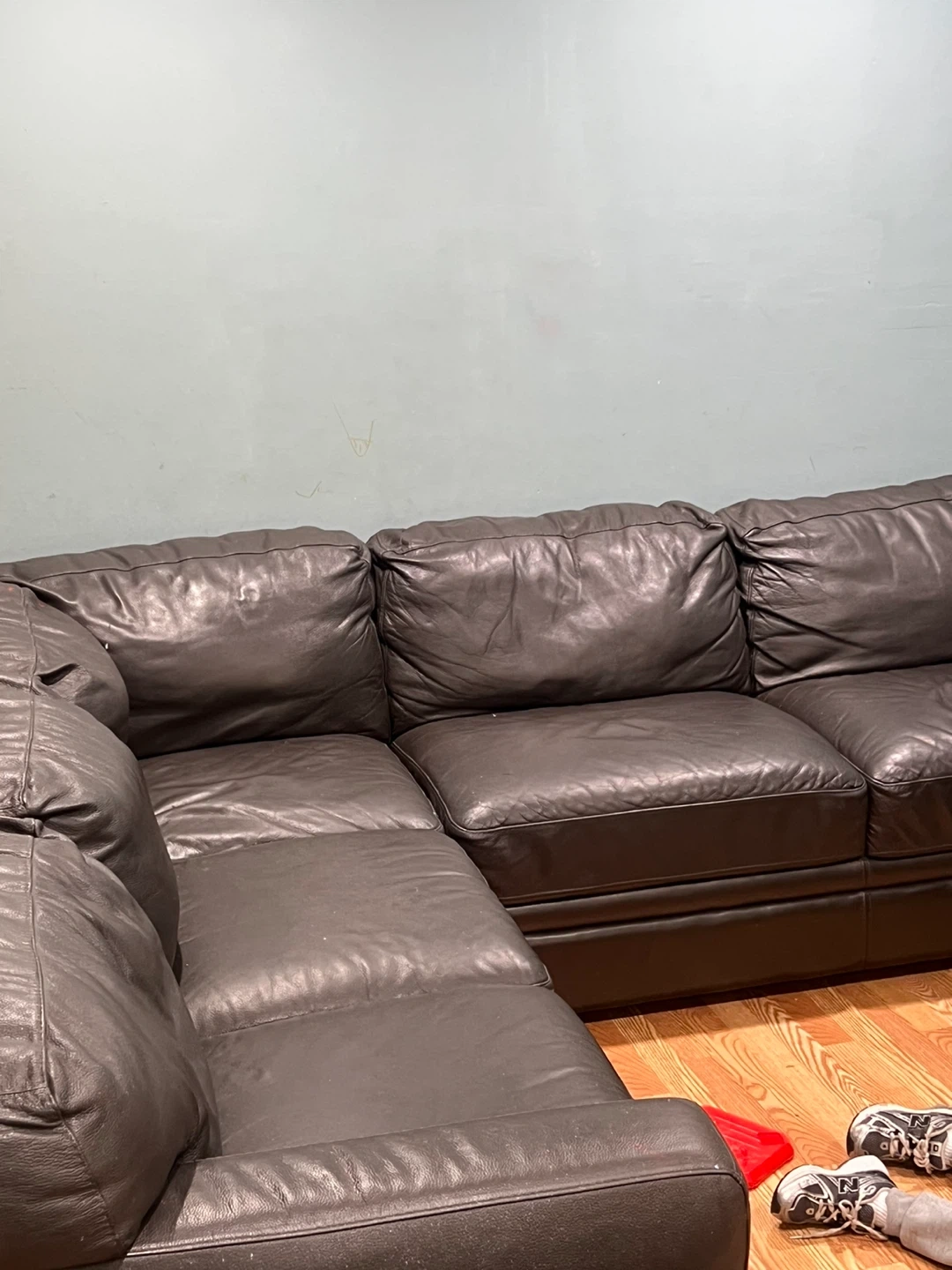 10Selling a comfortable leather sectional sofa in brown. It's perfect for a living room or entertainment area. The sofa shows some signs of wear but is still in good condition and has plenty of life left
