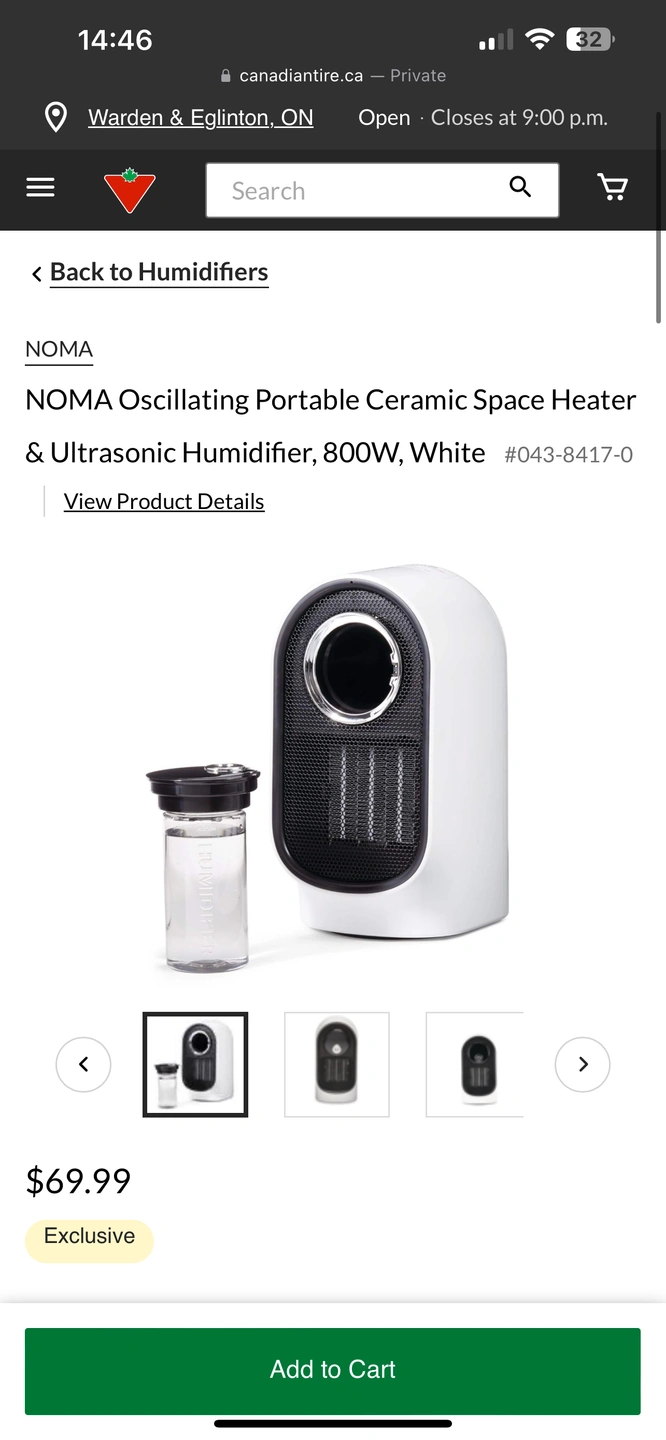 NOMA Oscillating Portable Ceramic Space Heater & Ultrasonic Humidifier, 800W, White Pick up Topham Park
