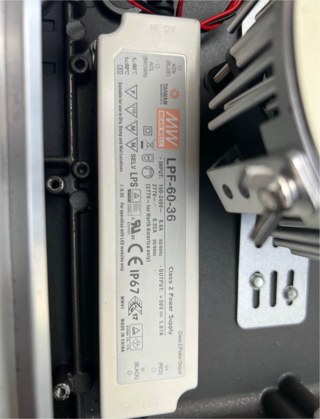 Selling an LED street light. It features a Mean Well LPF-60-36 power supply. The light appears to be in good condition and is ready for installation