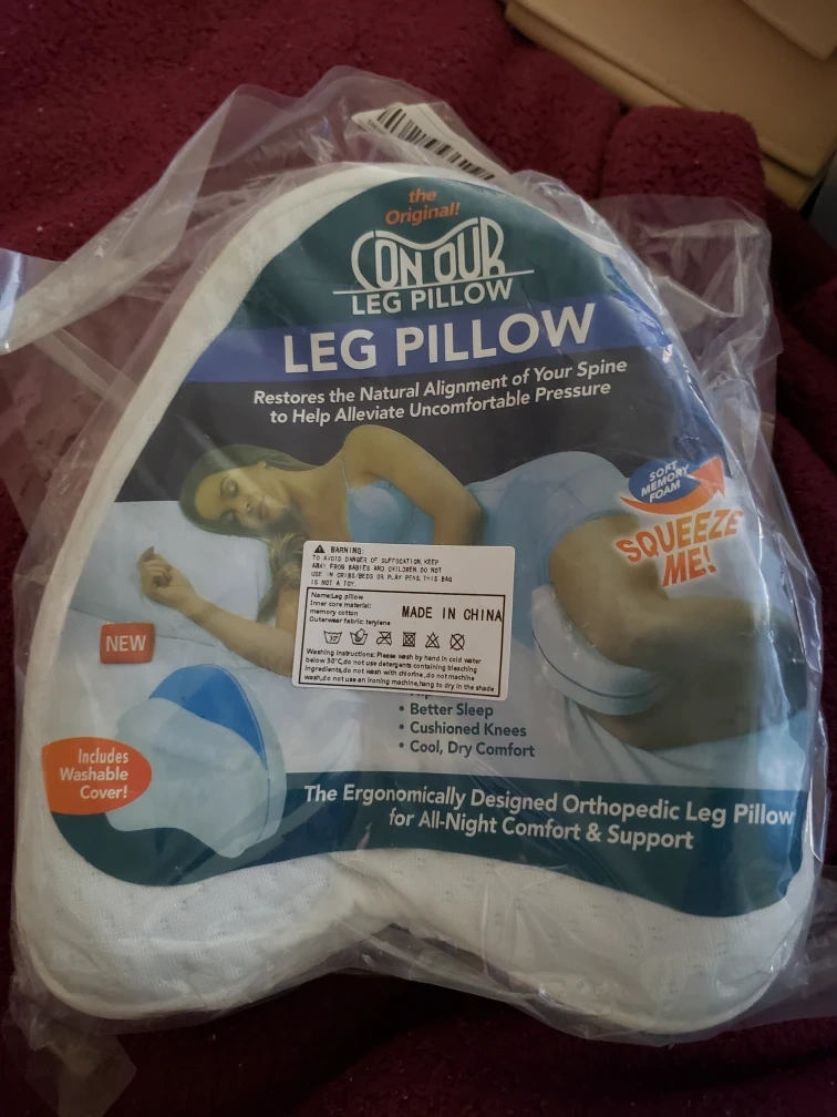 I'm selling a Leg Pillow, still brand new in its original packaging! It's designed to restore the natural alignment of your spine and help alleviate uncomfortable pressure. It features soft memory foam for comfort. The pillow is ergonomically designed for all-night comfort and support, and it comes with a washable cover for easy cleaning