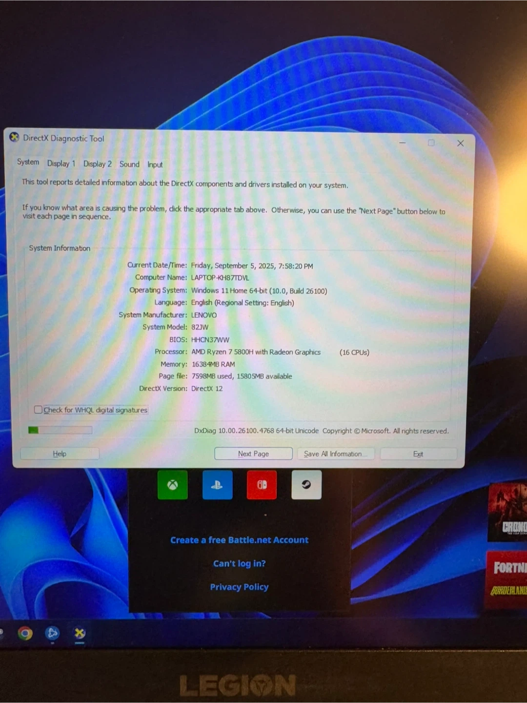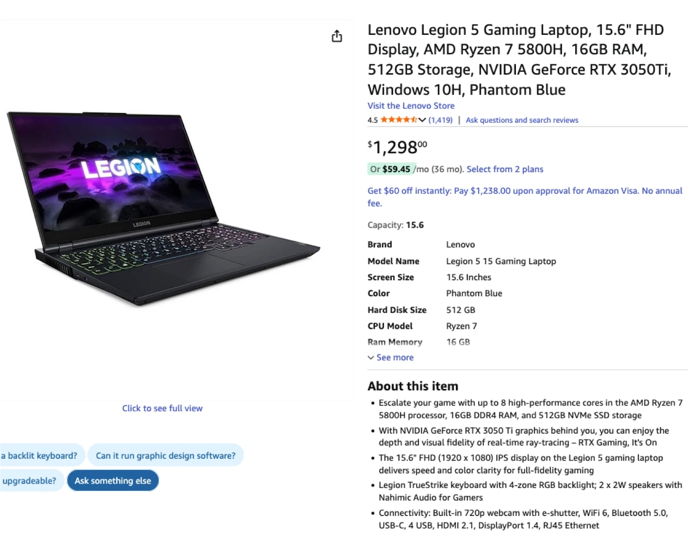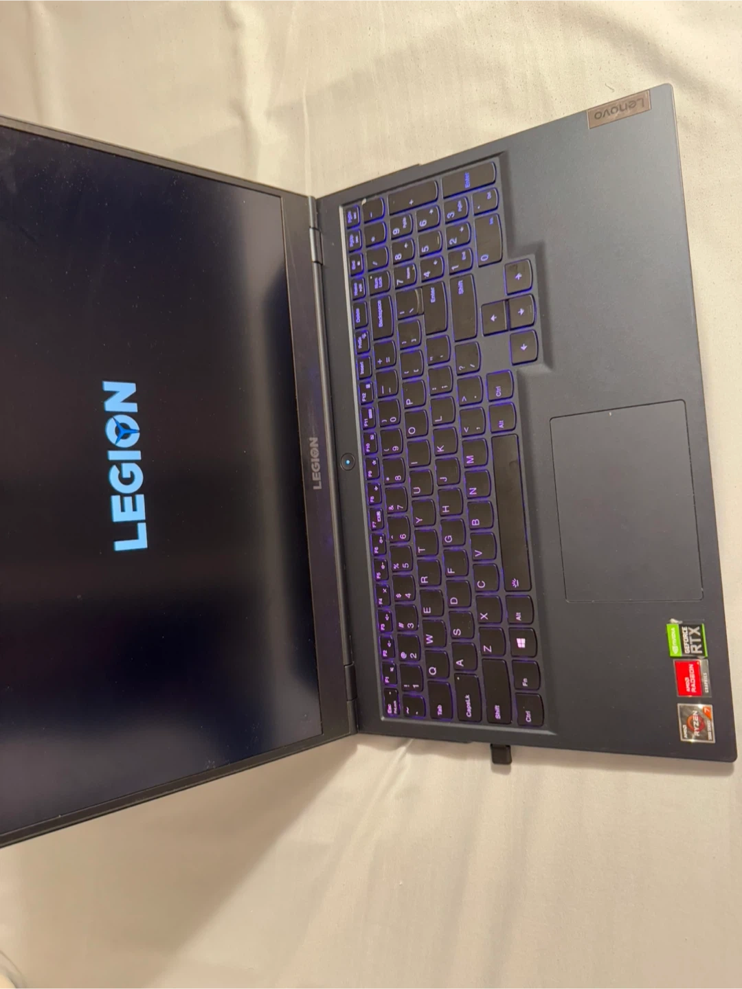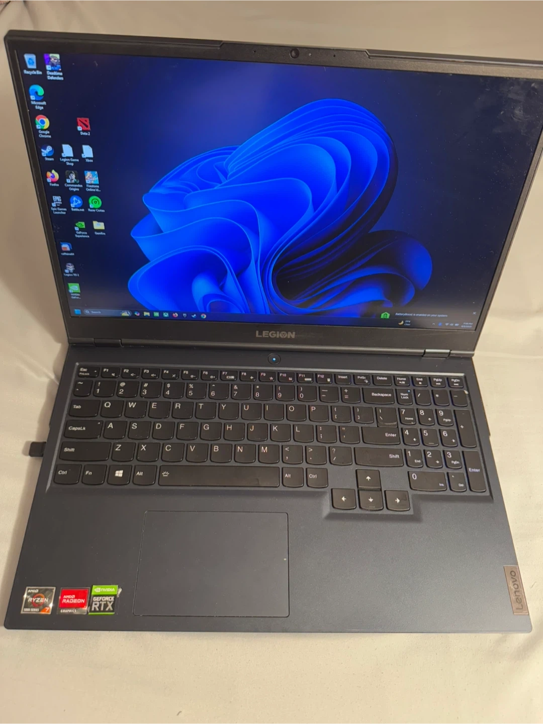 Selling a Lenovo Legion 5 gaming laptop! It features: - AMD Ryzen 7 5800H processor with Radeon Graphics - NVIDIA GeForce RTX 3050 Ti - 16 GB of RAM - Windows 11 Home 64-bit operating system - 15.6-inch screen - Model number 82JW