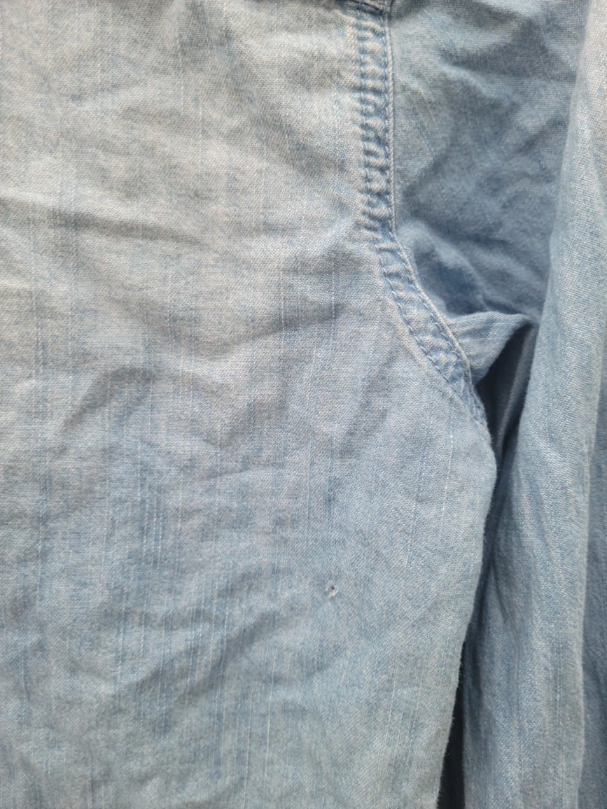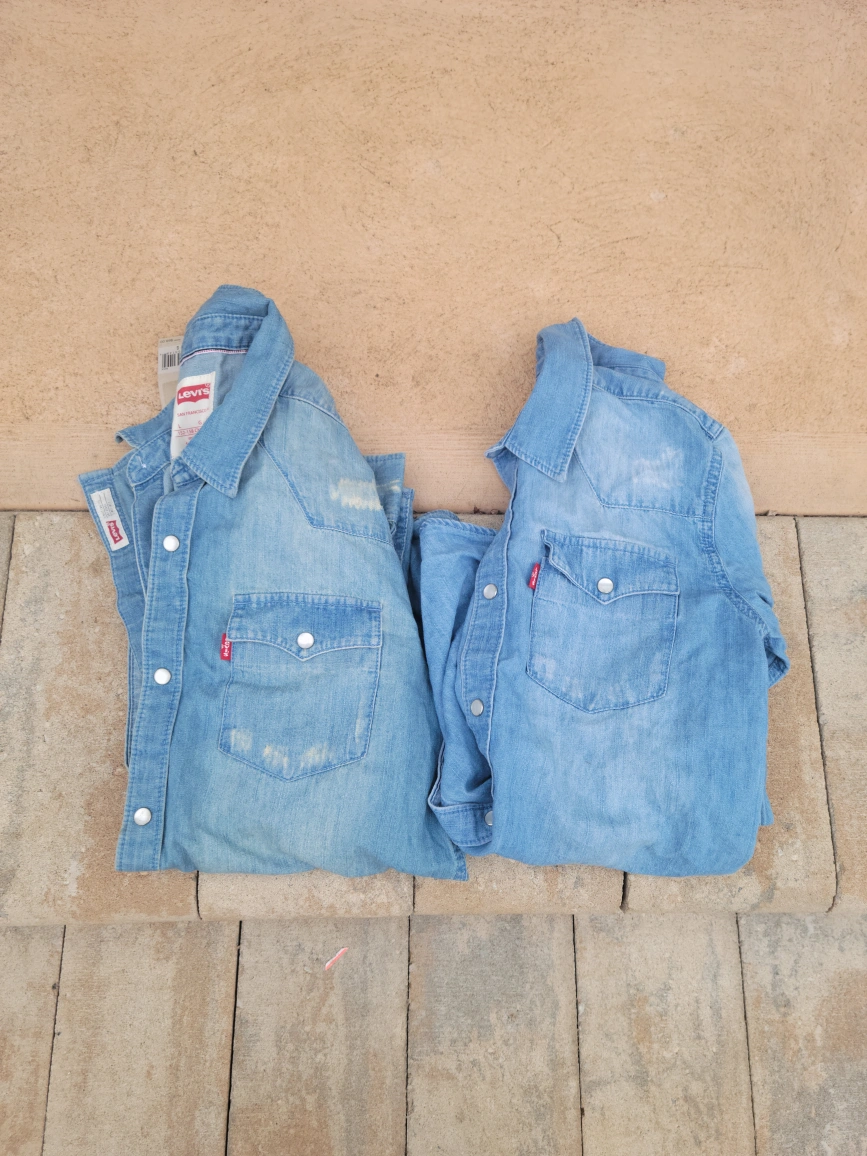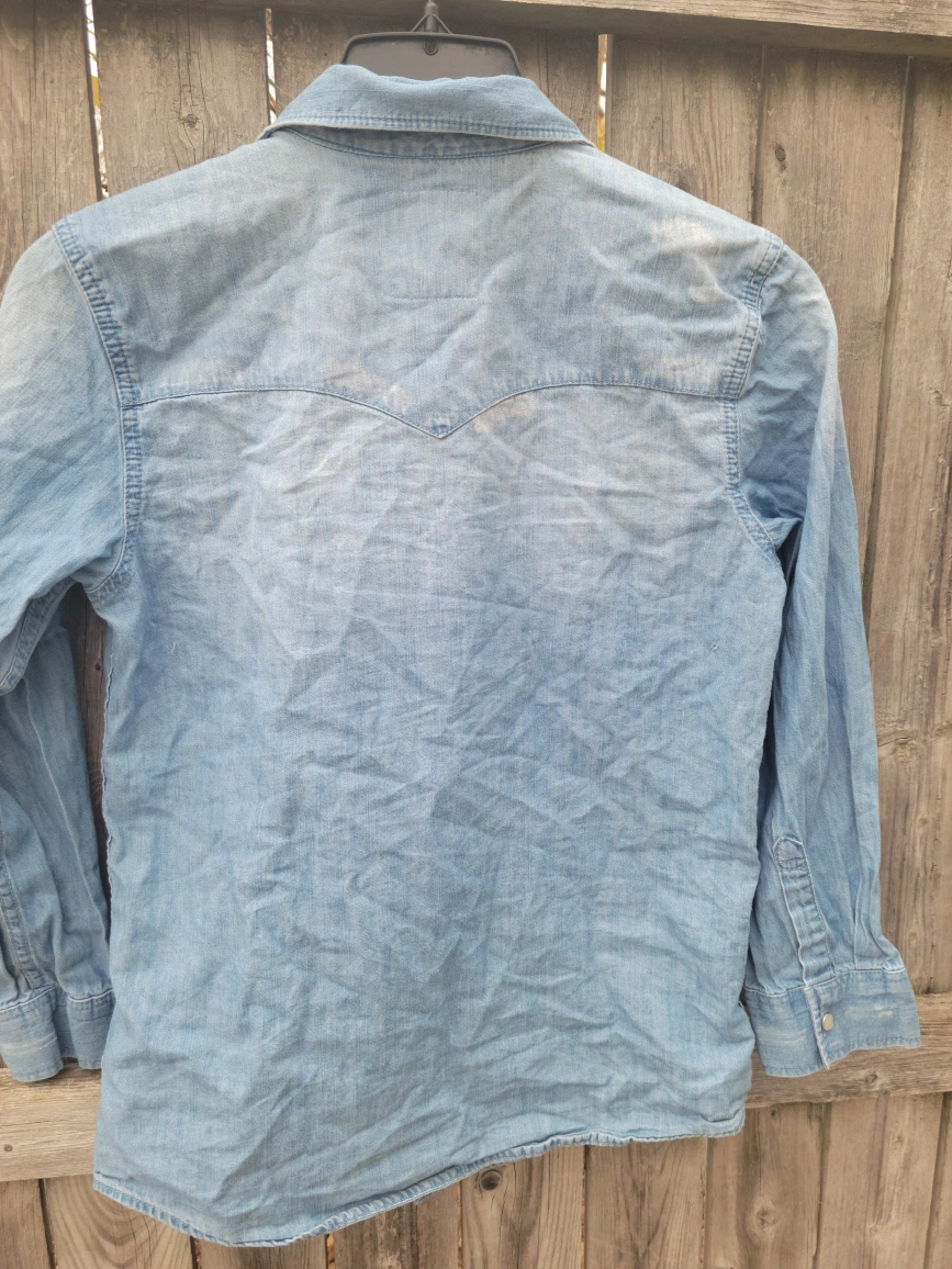 Long sleeve button up shirt with a smiley face star patch. Light blue denim.2 Levi's denim button down shirts. Size m(8-10), l(14-16).