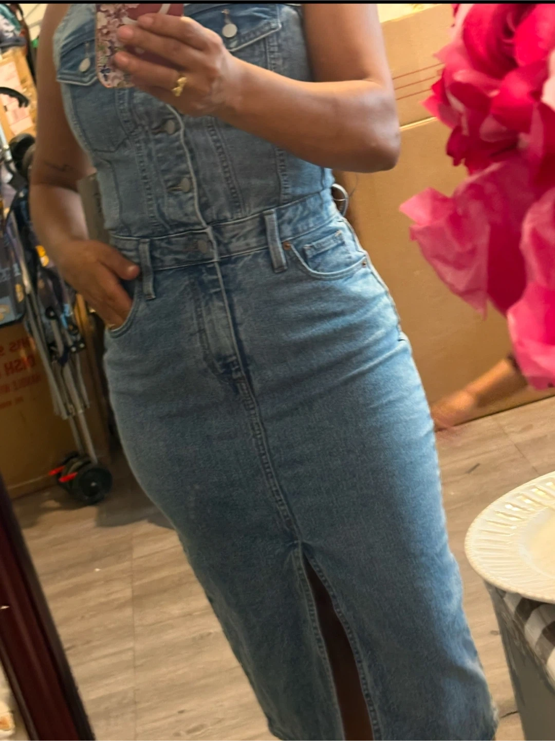 Levi's denim dress in great condition! It's a light wash denim with a button-up front and a slit. Perfect for a casual day out