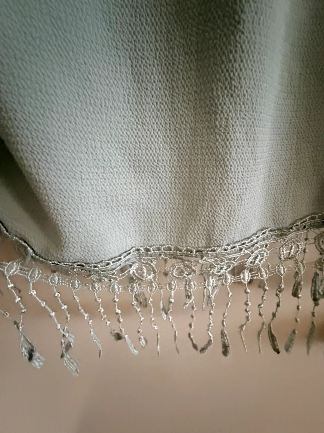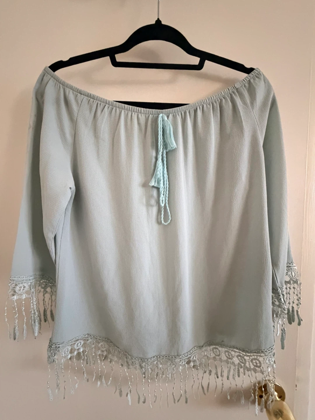 65This is a cute light blue, off-the-shoulder top with fringe detailing. It's perfect for a casual or dressy look. The material is lightweight and comfortable, making it great for warmer weather