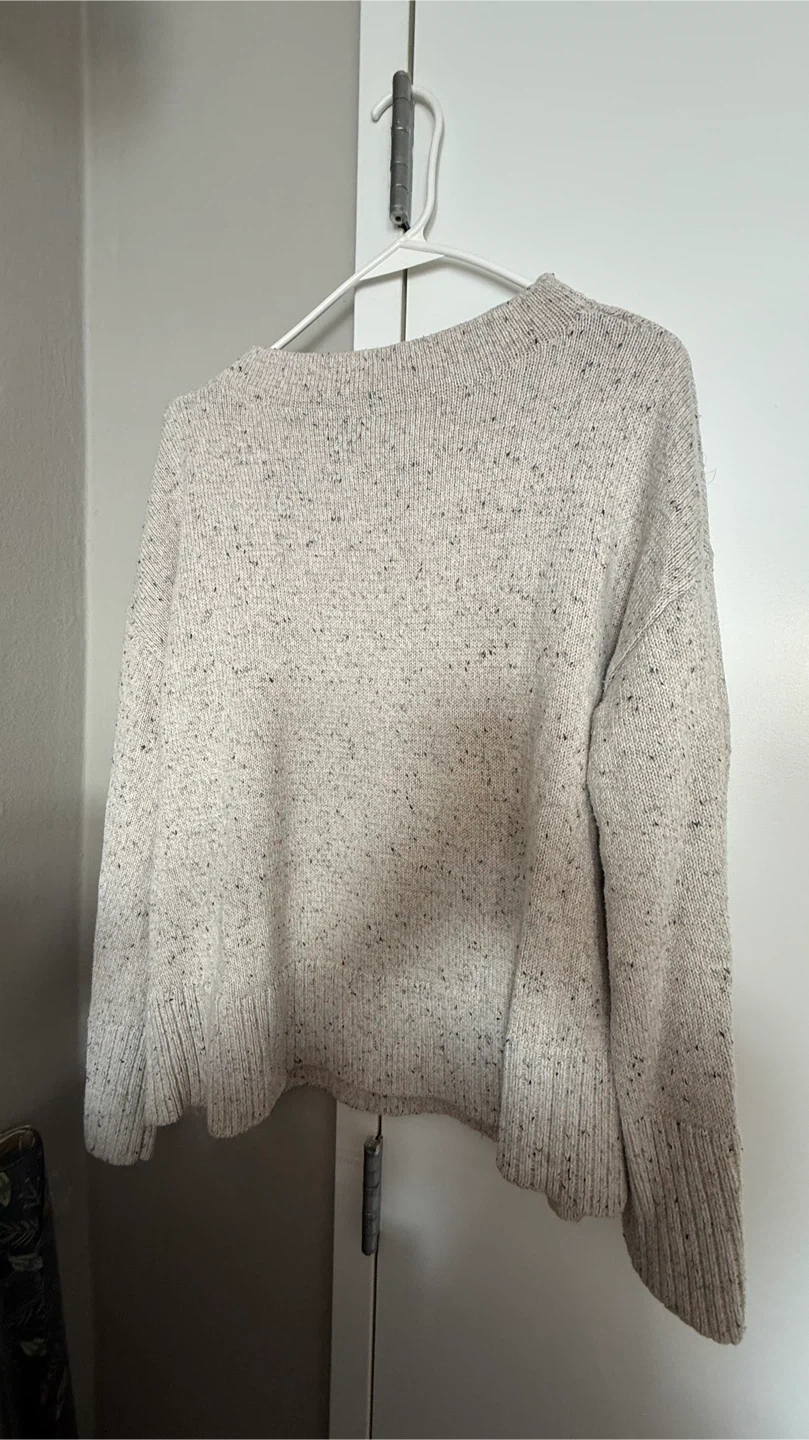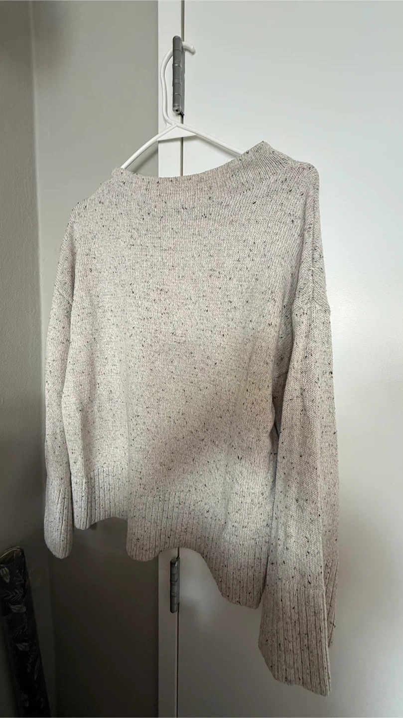 Selling a cozy oversized knit sweater. It's a neutral color with a speckled pattern, perfect for layering or wearing on its own. It's in great condition and ready for a new home